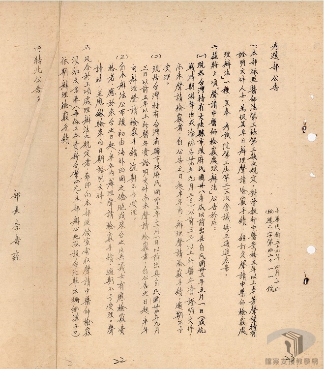 關於中醫檢覈之規定,當時的法規為:(一)曾經中央主管官署或省市政府領有合格證書或行醫執照者。(二)在中醫學校修習醫學,並經實習,成績優良,得有畢業證書者。(三)曾執行中醫業務五年以上,卓著聲望者。1949年前後,申請中醫檢覈者,多依據上述的規定來辦理,原因在於1949年以前,全國並無政府立案之中醫學校,所以當時許多人在報上刊登「銘謝某某名醫」、「聲望卓著」等廣告,就可以登記為中醫師,甚至有不少中醫是由關說或地方政府自行認定而發給執照者,故造成一些弊端。經過這段時期中醫檢覈規範之寬鬆,中醫師人數呈現大量之增加。西醫吳基福曾提及此現象,表示:「臺灣光復後,中醫從滅絕邊緣重振聲威。他們大唱中國文化的高調,發起國粹主義的旗幟,自稱為「國醫」,但可惜的,中醫不圖經由學術及教育的道路以建立基礎,提升水準,卻捨本逐末的,致力要藉『廣告』以起飛,正想從政治上取得與西學同樣的合法平等地位。」則展現的是西醫當時的擔憂與反對立場。