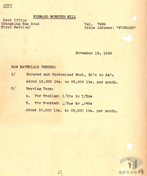民國39年(1950)政府扶植與保護紡織業的發展,制定〈臺灣省獎勵發展紡織業辦法〉,在臺灣區生產事業管理委員會下設立「紡織小組」,定期向行政院經濟安定委員會提報紡織業的供需情形。政府透過美援購入紡織原料棉紗,再分配給紡織廠,讓紡織廠「代紡代織」,最後產品交由政府銷售,以增加外匯存底。另外38年亦曾引進德克薩斯州展覽會比賽冠軍的「安哥拉山羊」空運來臺,準備在臺繁殖,以加強紡織業競爭力。另一方面也曾有澳洲的羊毛公司提出欲提供臺灣的毛織廠羊毛原料的商業計畫。