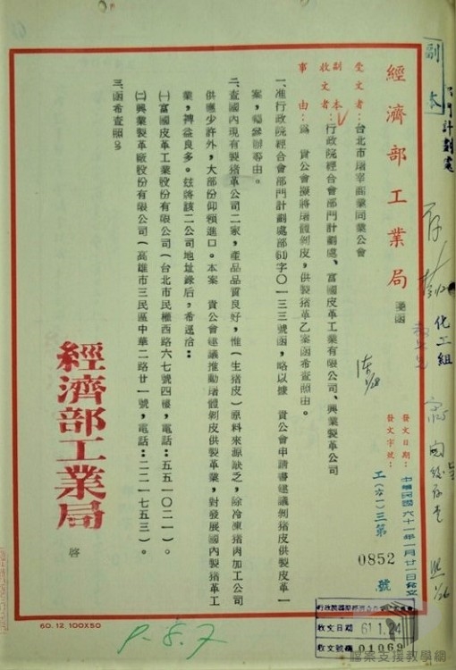 由於臺灣的製革產業過於仰賴國外的原料,國內廠商組成同業公會等組織多次向政府提出減輕進口關稅,或是開放豬皮製革的建議。由於臺灣的養豬業興盛,能夠提供豐富的製革原料,透過民間廠商多次陳情與政府部門派專家學者赴國外考察之後,才逐漸指定特定的屠宰場,開放讓廠商進行運用豬皮製革的試驗。