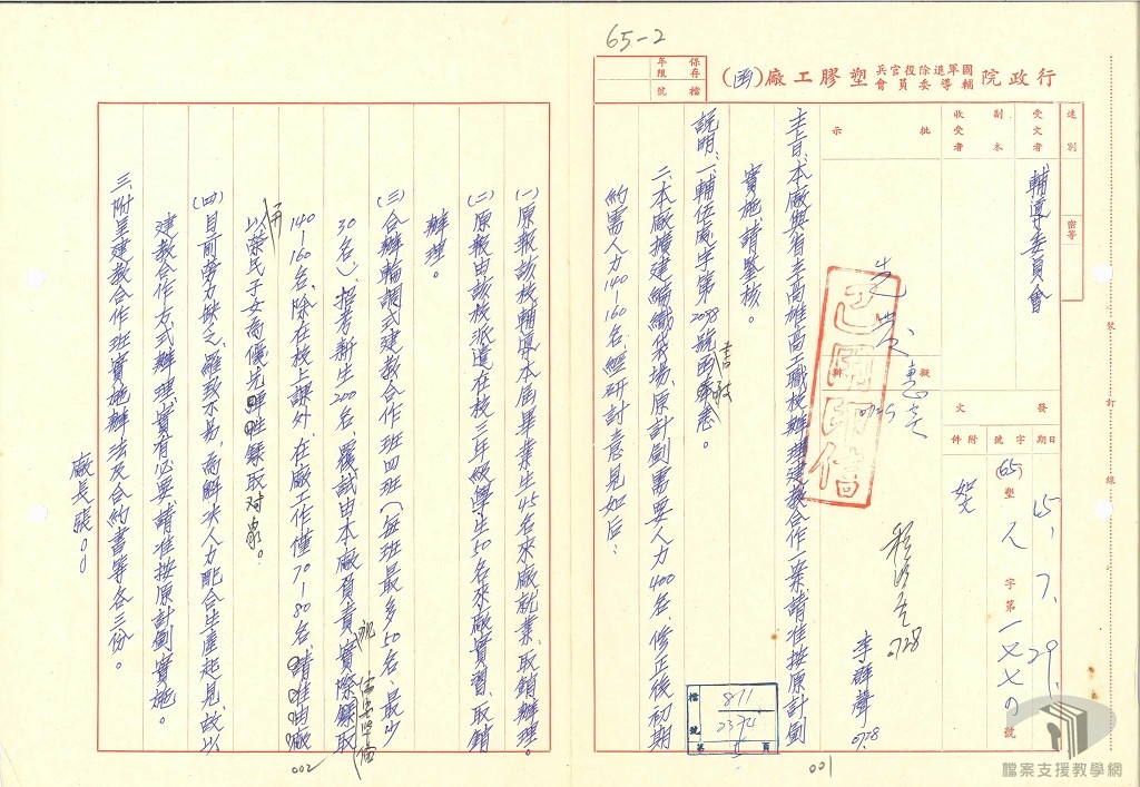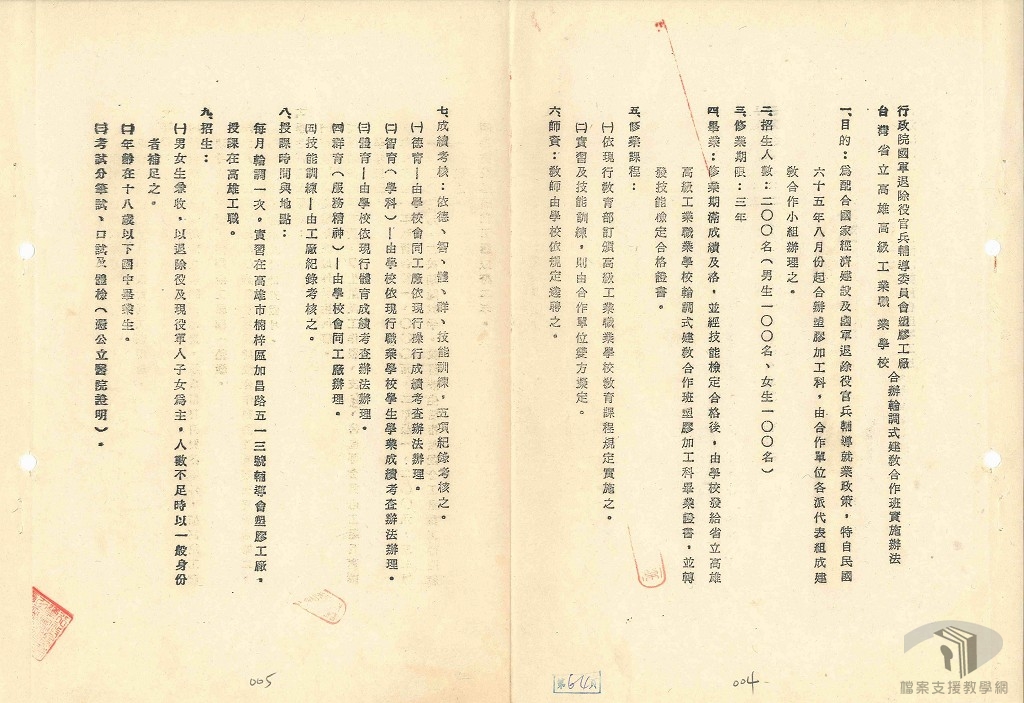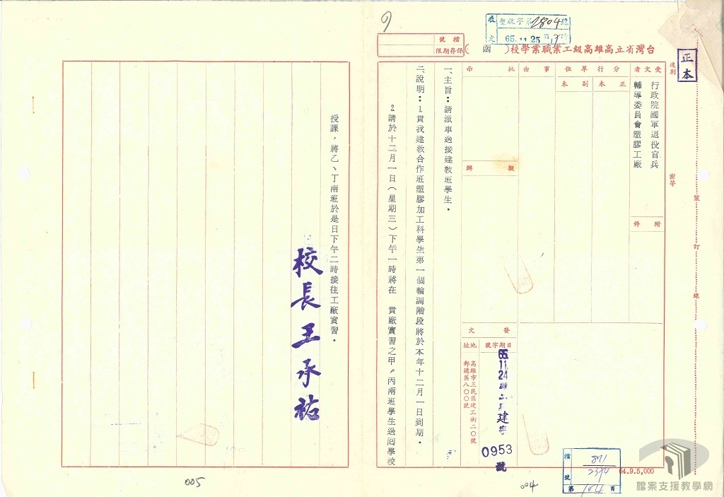 民國65年(1976)行政院國軍退役官兵輔導員會塑膠工廠擴建編織袋場,急需勞動力。廠方認為當前勞工缺乏,不易招聘足額,為解決人力、配合生產目標起見,評估若採取建教合作方式辦理,既能補充足夠的勞力,亦能自行訓練合適的員工,不失為一個兩全其美的辦法。遂與臺灣省立高雄高級職業工業學校塑膠加工科簽訂合辦「輪調式建教合作班」,共招收男、女學生各100名,學生在學校的教學時數與在工廠的實習時數各佔一半。