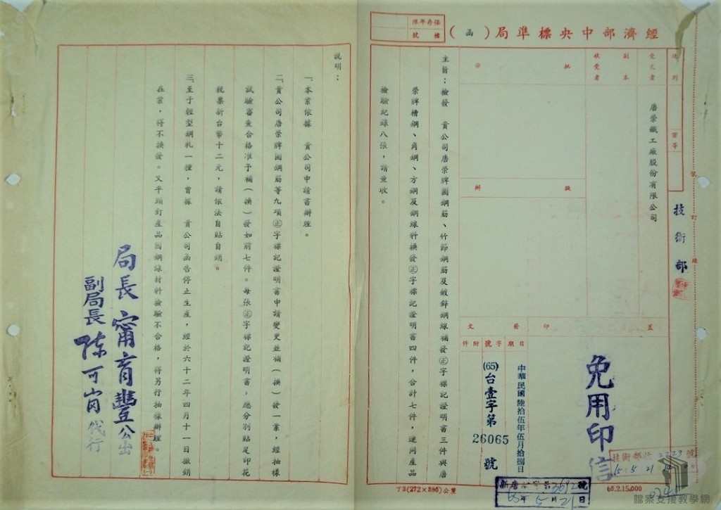與營造息息相關的室內裝修物料,從唐榮鐵工廠製造與申請的正字標記產品可知當時該廠的唐榮牌各種鋼鐵製品,提供鋼筋產品;另一方面,室內不可缺少的傢俱——電燈管,臺灣也有自己的品牌,為創立於民國43年(1954)間的臺灣日光燈股份有限公司生產「旭光牌」燈管,除了自給自足亦外銷出口。