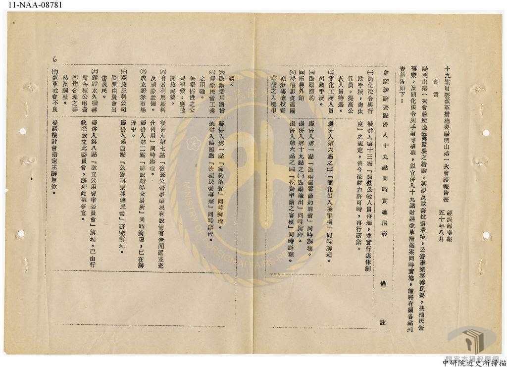 民國54年(1965),美國正式停止對我國的援助貸款。為因應新局勢,政府早在民國49年(1960)提出「十九點財經改革措施」,主要目的在於美援結束後,臺灣經濟能夠達到自給自足程度。其主要項目計有獎勵儲蓄、創設資本市場、經濟活動正常化、扶植民營事業、鼓勵投資、改善投資環境、成立公用事業費率委員會、凍結軍費、改善租稅制度、調整公務人員待遇、建立中央銀行體系、單一匯率、鼓勵出口等。