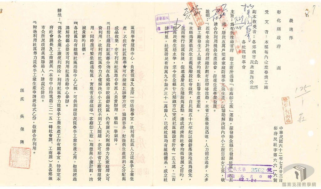 1960年代後期,臺灣的出口擴張政策,已獲致相當的成果。當時,許多小工廠接下外國訂單,卻又人手不足。為了加速經濟的發展,並繼續擴大外銷,民國61年(1972)臺灣省主席謝東閔提出「客廳即工廠」口號,鼓勵各工廠將部分加工性質的工作分包給附近地區的家庭主婦,讓家庭主婦將零件攜帶回家組裝、加工。
