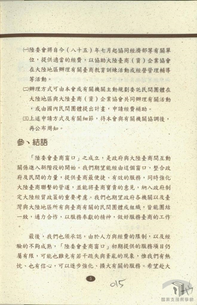 民國76年(1987),政府開放民眾赴大陸地區探親。隨之,臺灣與中國大陸的民間交流日益頻繁,而雙方的經貿關係快速發展,臺商赴中國大陸間接投資更是日益普遍。據統計,在民國84年(1995),臺商已佔中國大陸外資中的第二位;同時,中國大陸則成為臺灣的第四大貿易對象。以後,這個數字還要持續成長。如何在海峽兩岸特殊的政治情勢中穩定發展經貿關係,則是考驗政府與民間智慧之事。