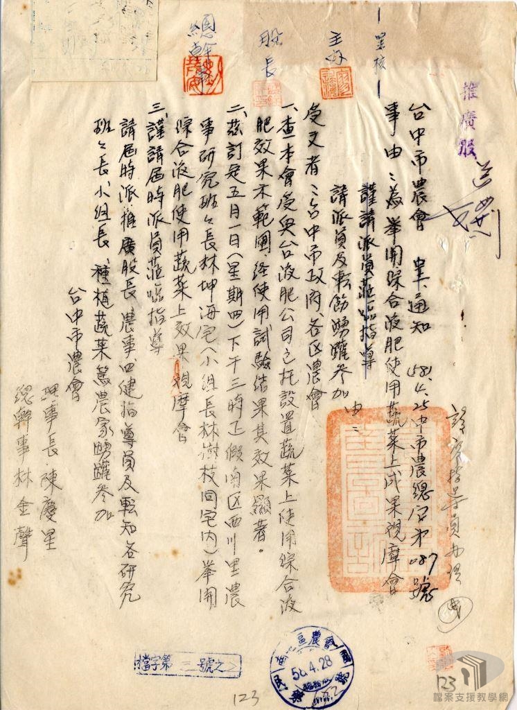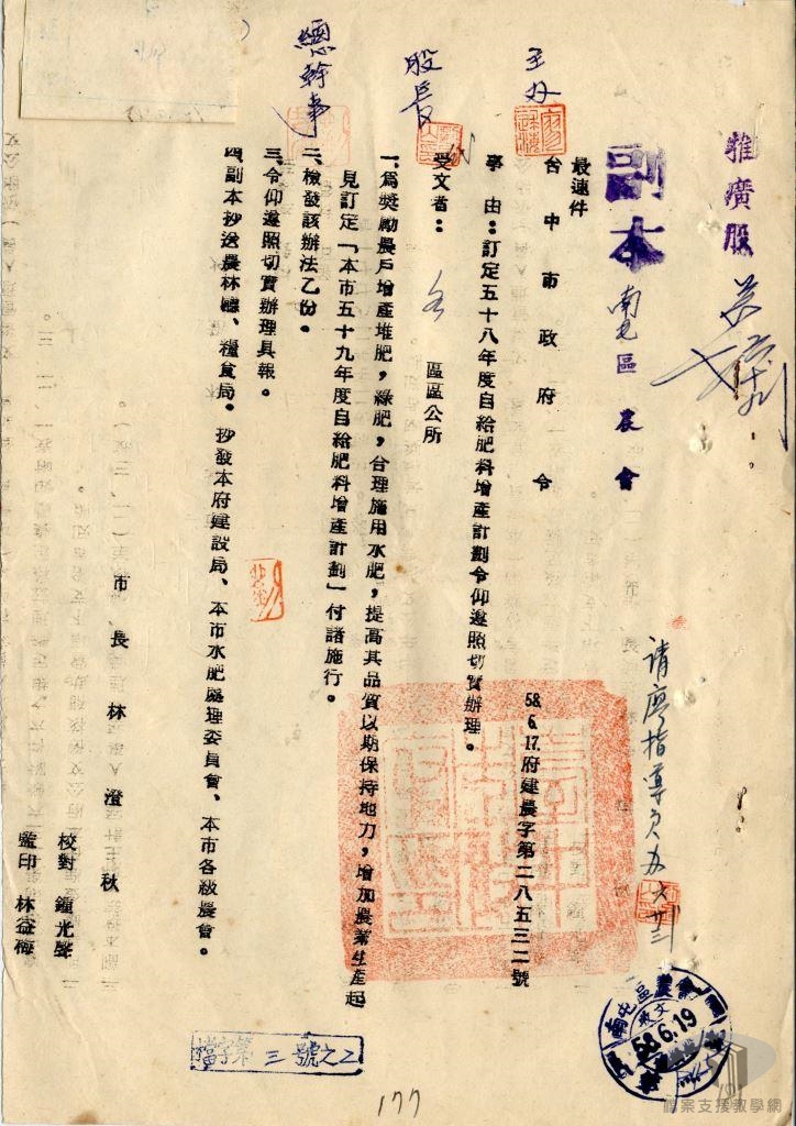 肥料是農業生產過程中必須的資材,為確保作物良好收穫,農民根據作物需求及土壤肥力狀況適度施肥。肥料的來源可區分為有機與無機兩大類:有機肥料又稱「天然肥料」,是由有機物質自然腐化形成。無機肥料則常被稱為「化學肥料」或「合成肥料」,通常是從非生物體或無機化合物、礦物中提煉製成。臺灣農民早期多使用人畜排泄物或堆肥等有機肥料為農作施肥,日本統治期間又開始發展化學肥料工業。臺灣光復以後,政府為發展農業,先後設立臺灣肥料公司、高雄硫酸錏公司生產化學肥料。此後在農產研發單位的努力下,又先後引進各種綠肥作物、研發合成堆肥,為保障島內糧食供應與農產外銷創匯奠立基礎。
