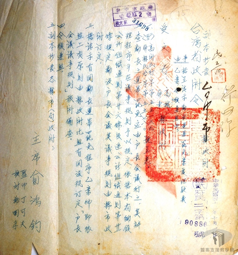 民國36年(1947),中華民國實行憲政,根據《中華民國憲法》,地方自治工作原應依據中央省縣自治相關法令進行。但由於內戰與兩岸分治的政治發展,中央法令遲未完備,在政府與參議會的努力下,臺灣地方自治事業是以制訂省地方法規,再由行政院同意公布實施的方式進行,例如行政院於民國39年陸續公布《臺灣省各縣市實施地方自治綱要》、《臺灣省縣市行政區域調整》等方案成為臺灣地方自治的法制基礎。民國39(1950)至40(1951)年間,臺灣省分期調整縣市行政區域,將原有8縣9市重新劃分為16個縣及5個省轄市,各縣市還以分區、分梯次的方式進行了縣市長與民意代表的選舉工作。