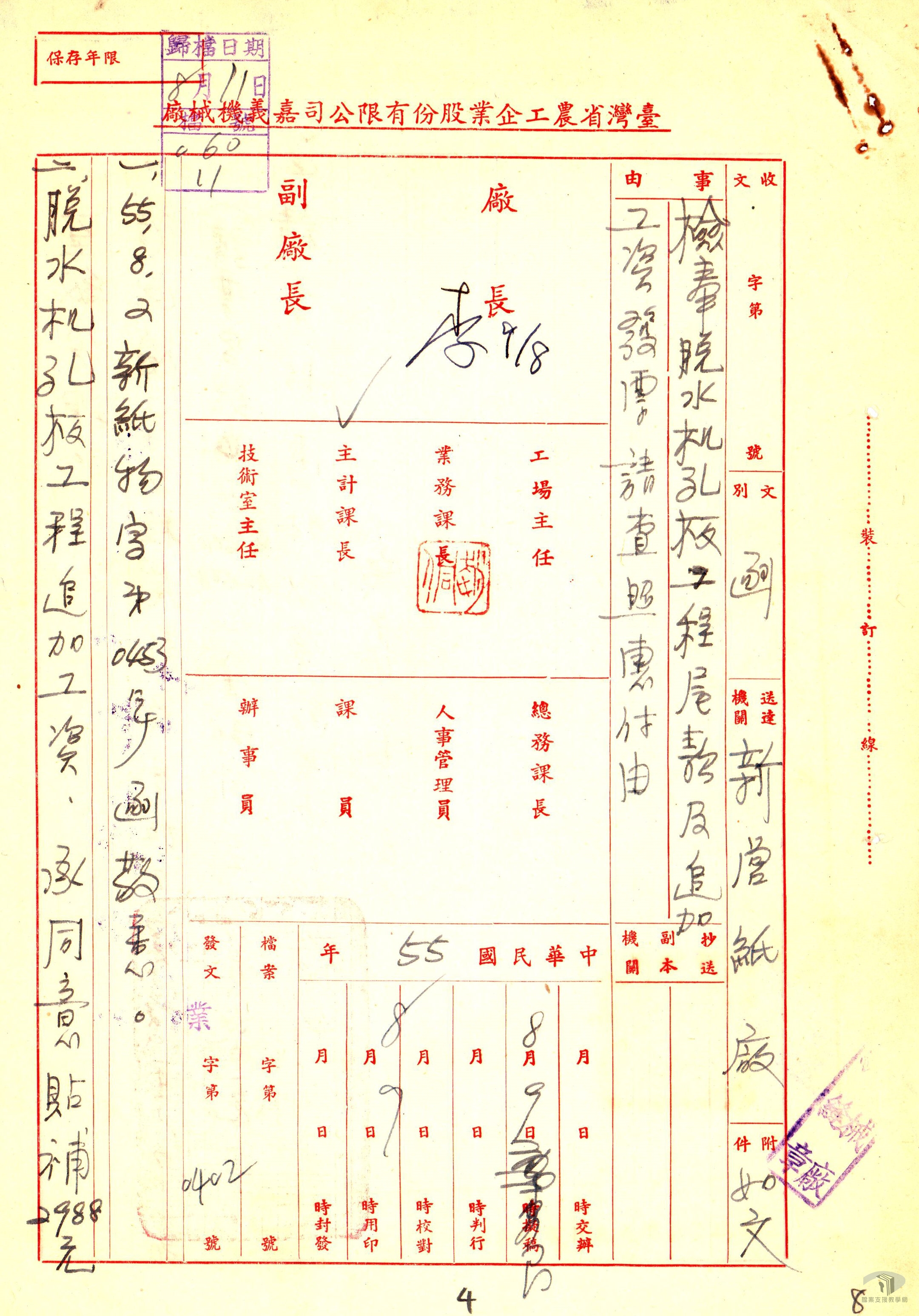 政府接收臺灣期間,在日產公有的基本計畫下,電力事業自不例外。尤其臺灣電力株式會社擁有超過六千名員工,其中日籍員工超過半數,更需妥慎處理日籍人士遣返之後的發電問題。經過一連串改組,民國35年(1946)5月,臺灣電力有限公司成立,由行政院資源委員會與行政長官公署合辦。此刻,原本日籍員工超過半數的臺灣電力有限公司,終於調整成近4,600人,僅有不到一成日籍員工的狀態,成為臺灣本土型態的電力企業。民國40年(1951),臺灣電力股份有限公司改組成立,即今日所通稱的「臺電公司」。其業務範圍不僅只民生用電,亦包括提供水泥、工礦等大規模公營事業,是臺灣經濟發展的後勤支柱。