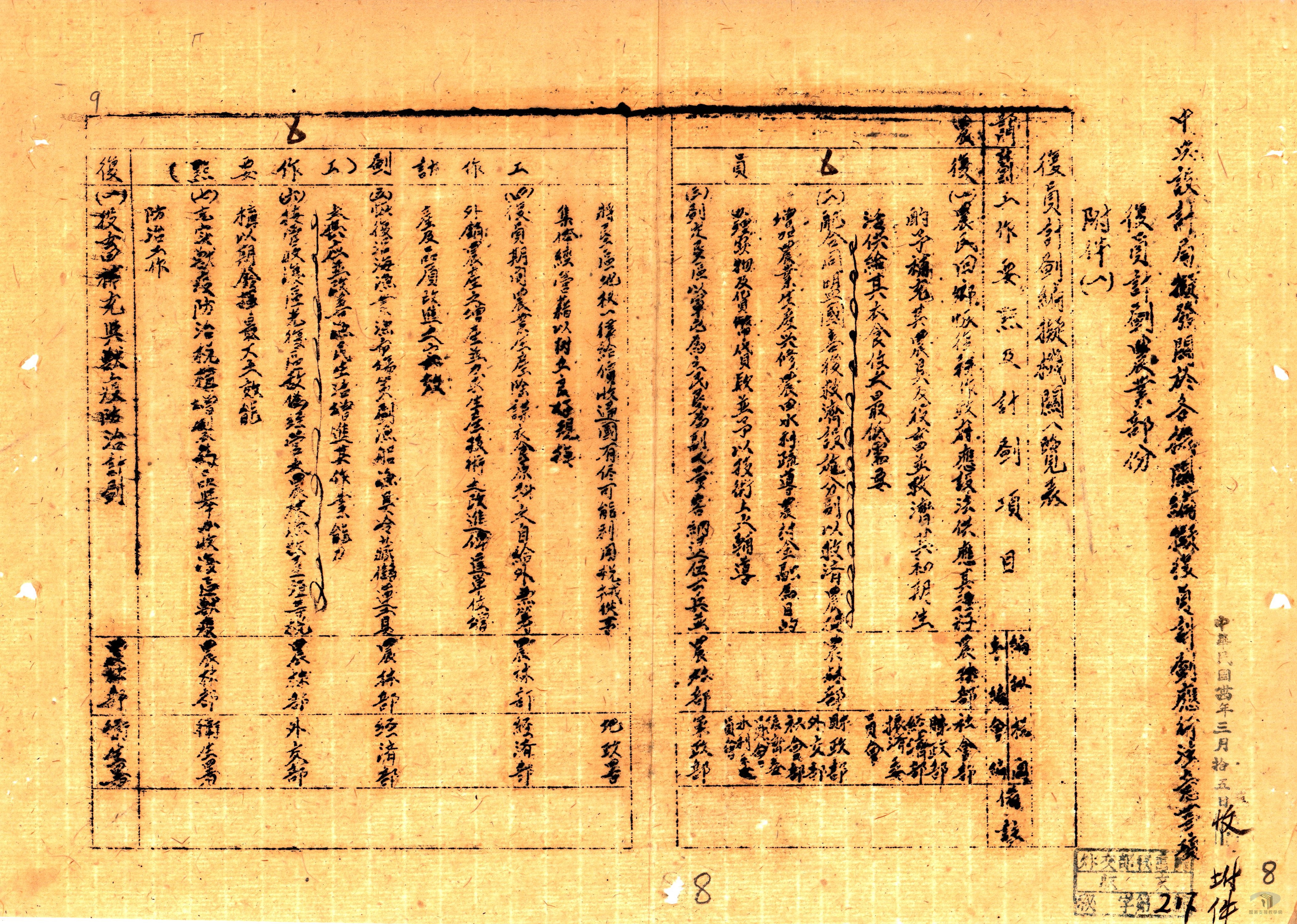 有鑑於戰爭破壞嚴重,掌控全國事務的中國國民黨,在民國29年(1940)設置中央設計局,規劃國家行政、經濟、國防等領域的建設藍圖。第二次世界大戰結束後,中央設計局協助重建規劃事務。民國34年(1945)2月,中央設計局就辦理戰後復員工作一事,擬具〈關於各機關編擬復員計畫應行注意事項草案〉,做為各主管部門編定復員重建計畫的依據。