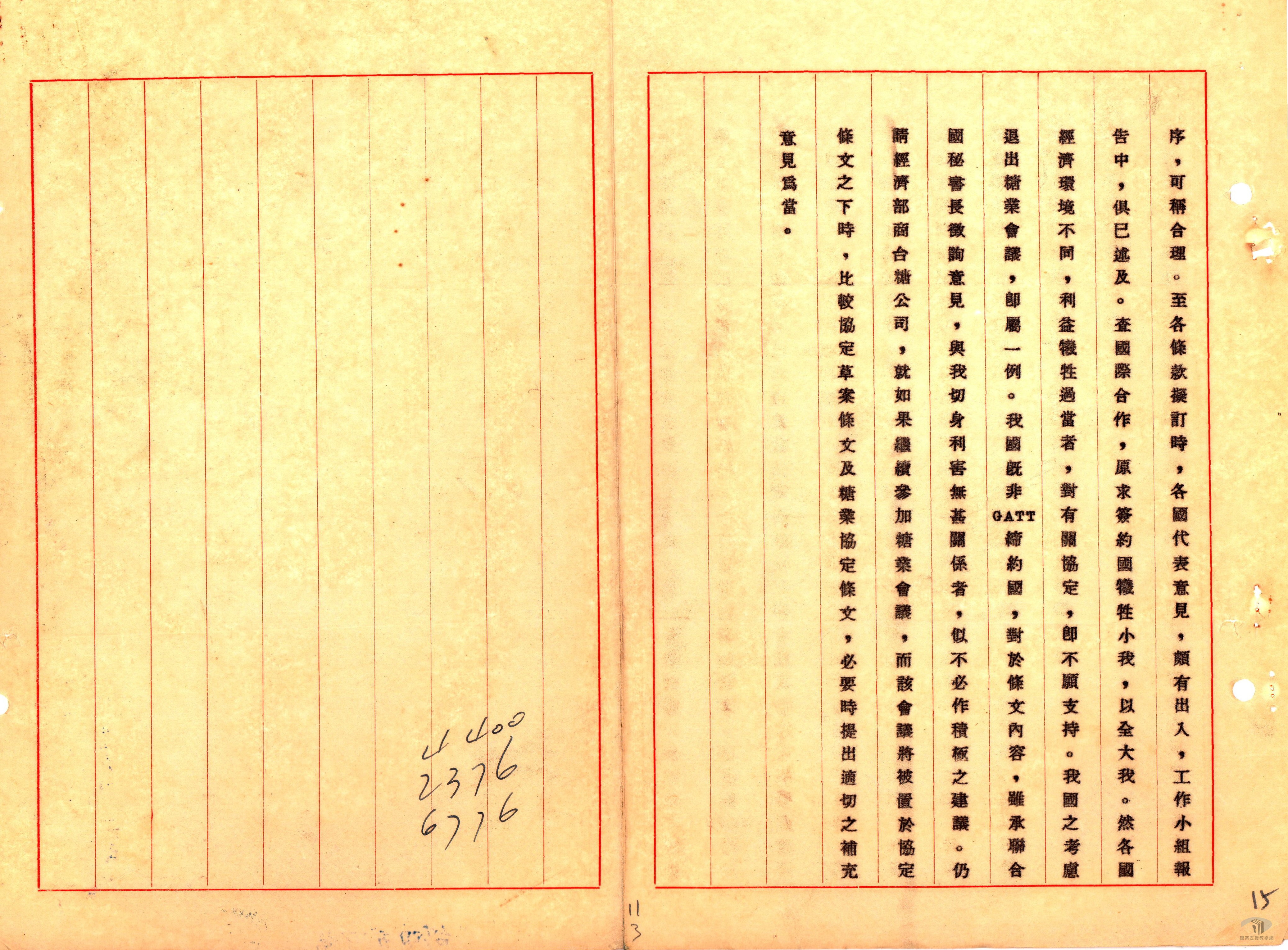 「關稅暨貿易總協定」的原則是自由(第11條:將貿易限制措施轉為關稅,以及降低關稅稅率)、非歧視(最惠國待遇、國民待遇)及多元化,必須在這三項原則下進行自由貿易往來。政府播遷來臺後,初期受益有限,曾於民國39年(1950)聲明退出,民國54年(1965)方再度參與。