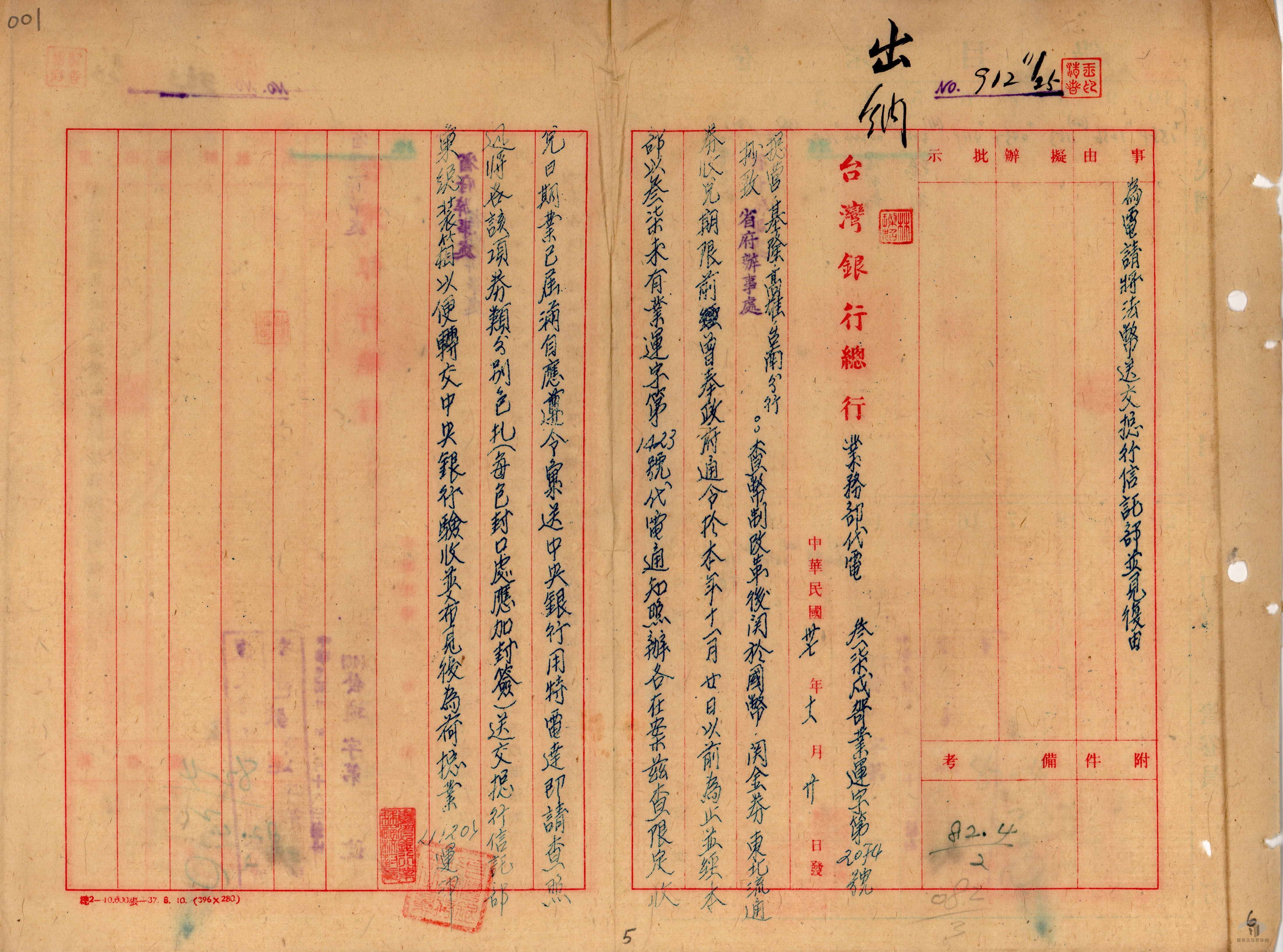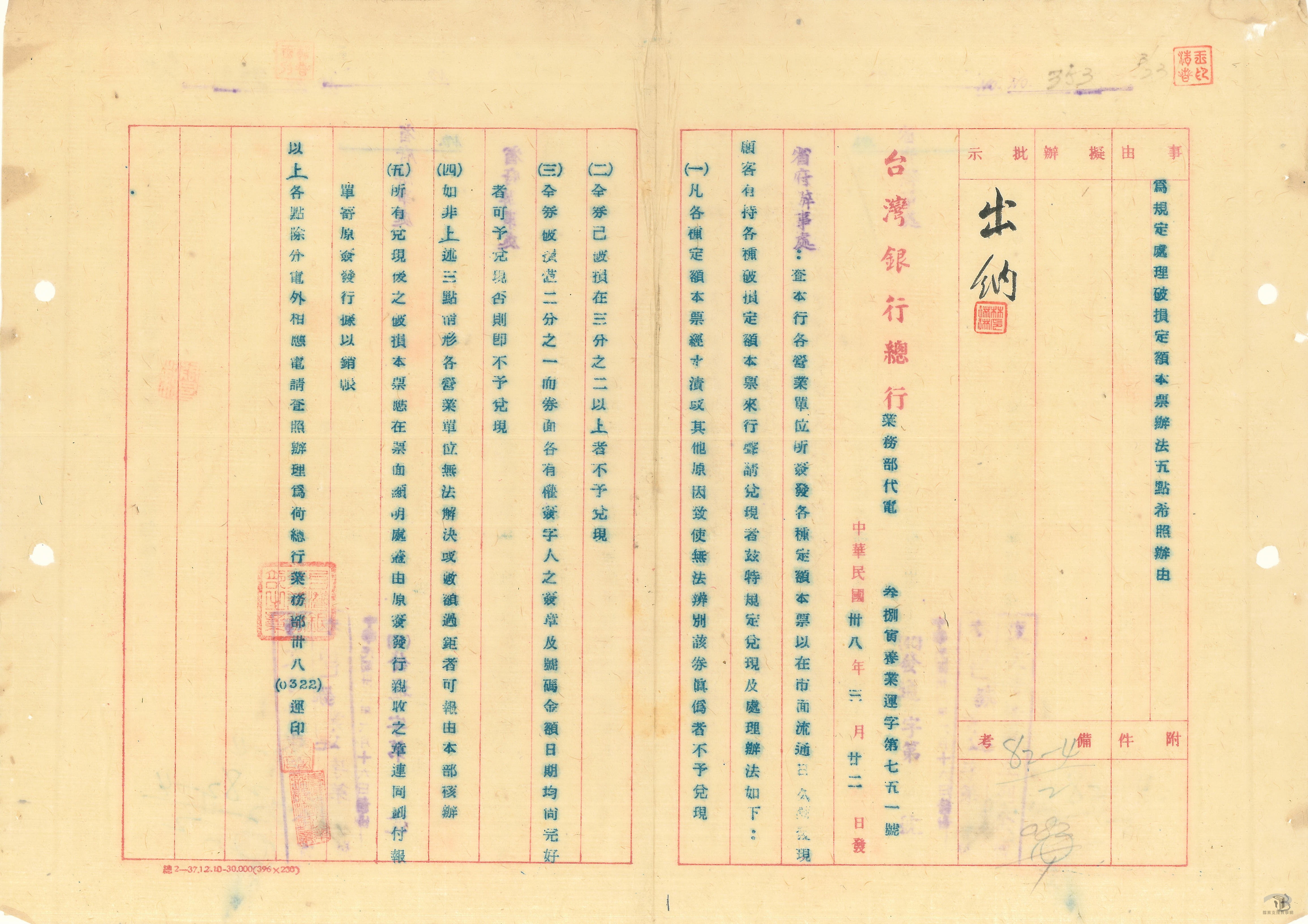 日本投降後,中央政府原本有意由中央銀行在臺設立分行,發行與法幣近似、但只能在臺灣流通的「中央銀行臺灣流通券」,並已印妥待送。不過最後決定尊重臺灣省行政長官陳儀(1883-1950)的意向,允許臺灣銀行券繼續流通。不過,臺灣銀行券曾在臺灣被正式接收前,出現近30億的發行量,價值有浮濫之疑慮。因此中央決定發行新貨幣因應,也就是臺幣兌換券。然而臺幣兌換券發行後,並無法阻止臺灣通貨膨脹的情況,也令臺幣兌換券大幅貶值。終於在民國38年(1949)以後,政府準備發行新貨幣,民國39年(1950)1月14日,臺幣兌換券正式停止流通。