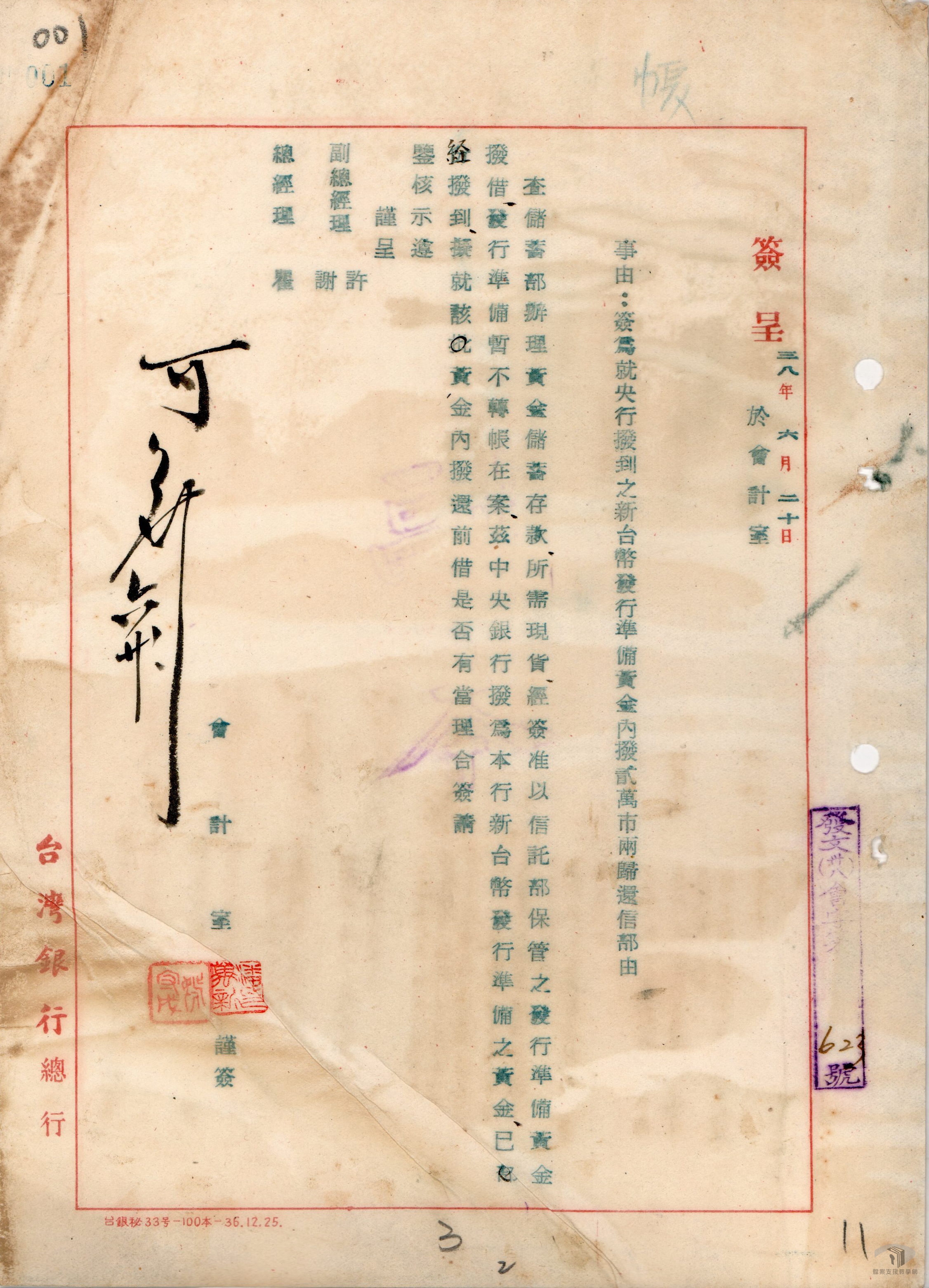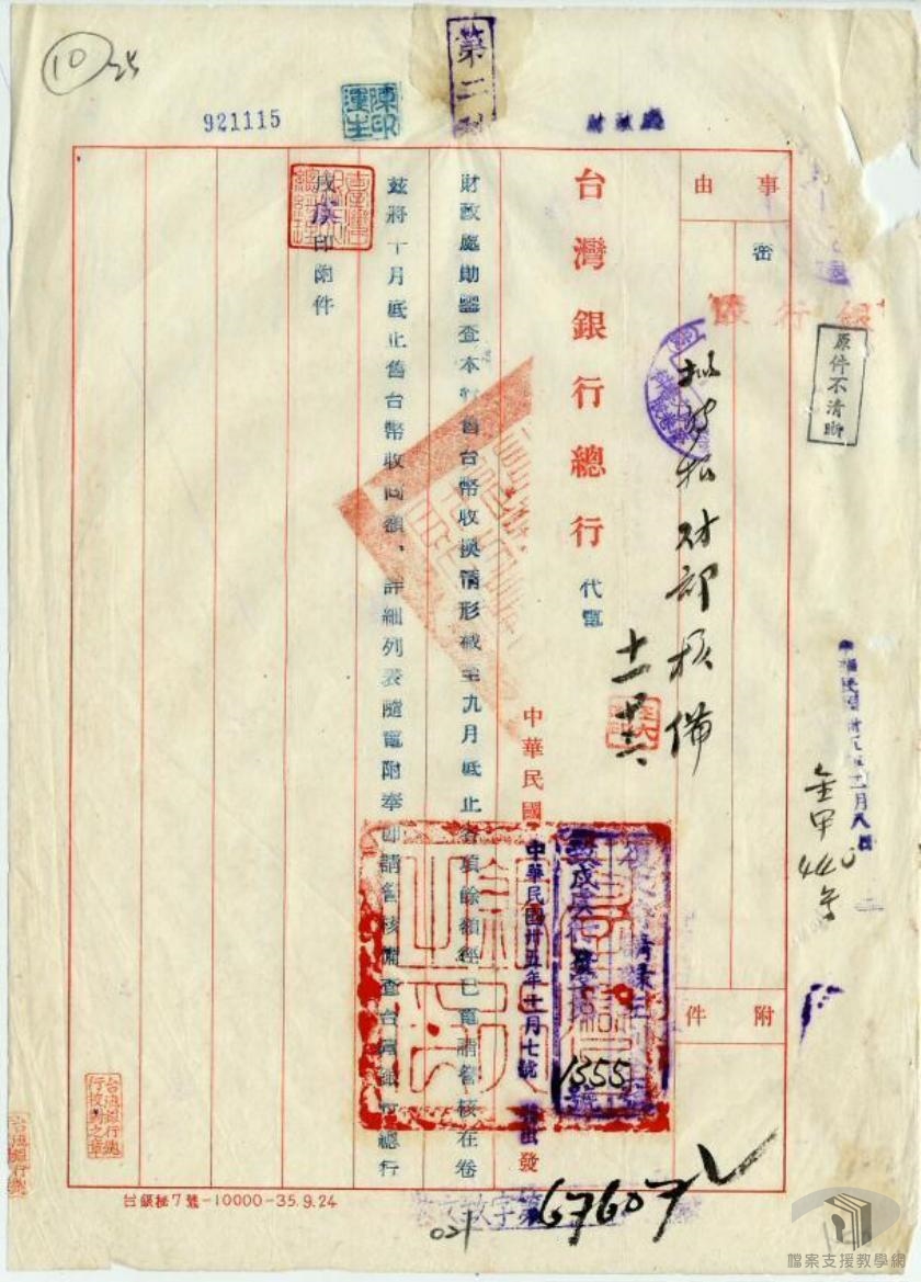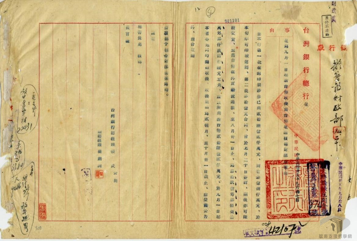臺灣在民國35年(1946)到民國38年(1949)間,因為經濟、社會狀況不斷,陷入嚴重的惡性通膨危機之中。為重建臺灣經濟,確保臺灣可在與共產黨的對抗中提供穩定的資源,臺灣省政府乃與中央銀行共同撥出黃金80萬兩,作為改革幣制之基金,並另撥一千萬美元之金額,做為進口貿易運用基金。民國38年(1949)6月15日,臺灣省政府公布《新臺幣發行辦法》,由臺灣銀行發行此一「新臺幣」,規定新臺幣最高發行額為兩億元,原有的臺幣兌換券,則需以四萬元合新臺幣一元的比率進行兌換,而外匯匯率則為一美元兌新臺幣五元。