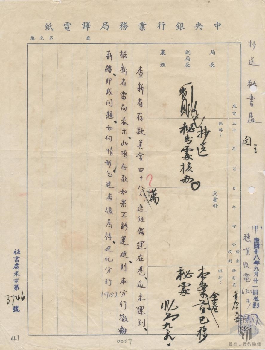 新省政府請撥還存本行美金案