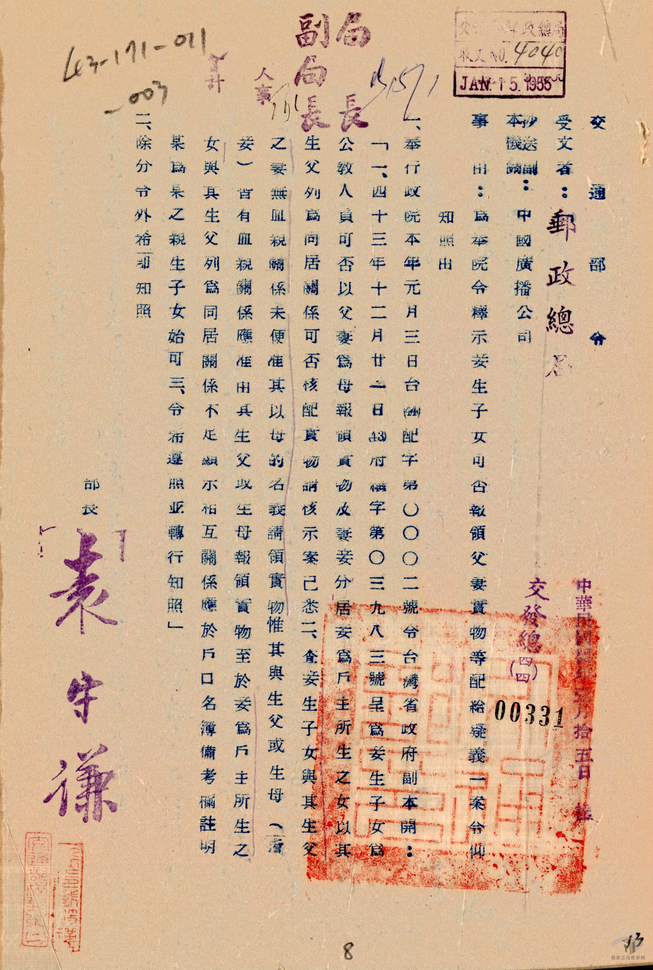 在中央政府決定遷往臺灣以前,臺灣地區總人口約有六百多萬,而自政府接收臺灣迄於民國39年(1950)年的這段期間內,約有一百二十萬人,自大陸地區進入臺灣。這表示在此短期內的臺灣人口,有超過三成的增幅,也帶來資源分配的問題。政府乃透過興建眷村、眷屬補助等方式,穩定來臺大陸人民的生活與民心。自此之後,這些公職人員連同其眷屬一起赴臺,建構臺灣族群分類中的其中一支,也是日後臺灣在各方面發展的人力基礎。