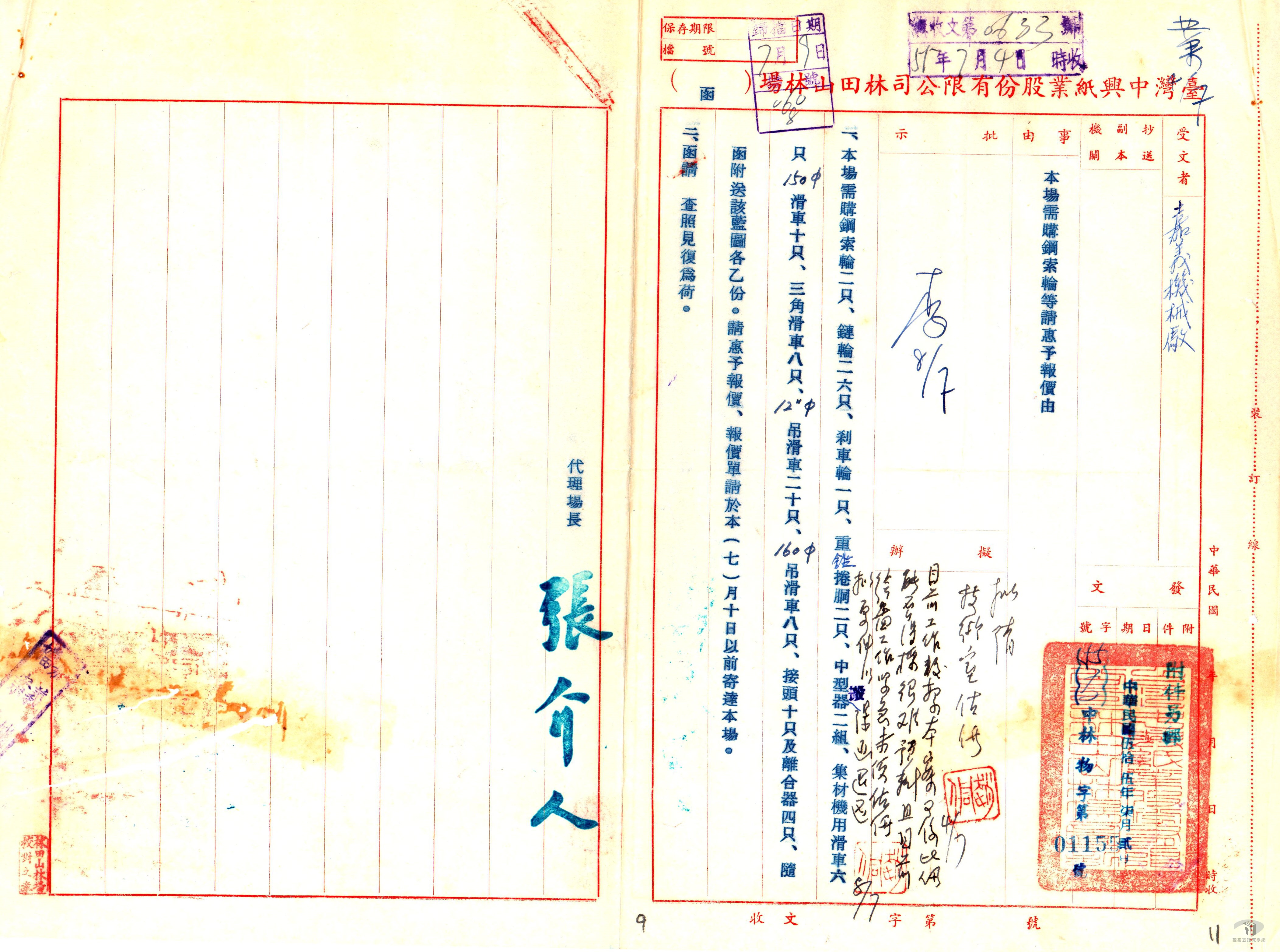 民國35年(1946)5月時,政府依據《臺灣工礦事業合作大綱》,令原屬日資的臺灣製紙株式會社、臺灣興業株式會社、臺灣紙漿株式會社、鹽水港紙漿工業株式會社、東亞製紙工業株式會社等五間紙廠,會同林田山林場,由政府合併接收。針對此一合併,中央政府與臺灣省政府合資,成立臺灣紙業公司,並於民國36年(1947)改組為股份有限公司。在管理部分,資源管理委員會握有重要人事的任命權,臺灣省方面則提供資金、物資、治安等協助,從中收取盈利。