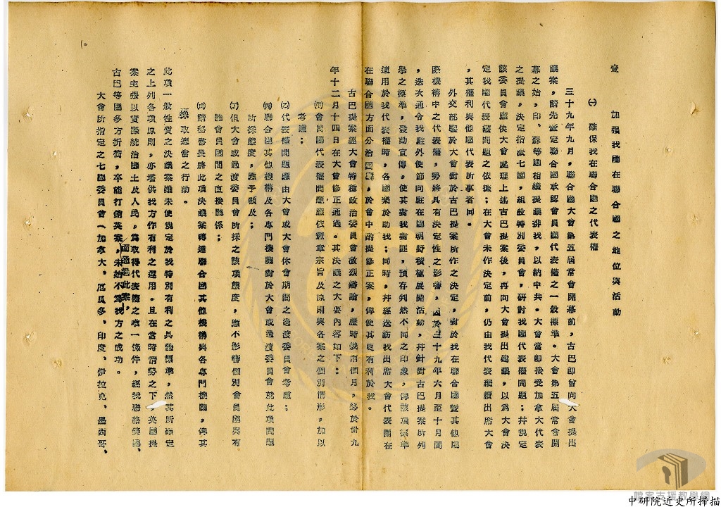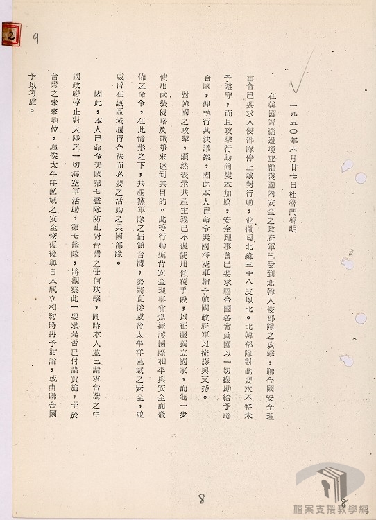 民國39年(1950),韓戰爆發期間,美國總統杜魯門(Harry S. Truman)於6月27日發表的杜魯門宣言中,除宣布實施臺灣海峽中立化政策外,亦言及臺灣未來的地位,應等到太平洋區域之安全恢復後與日本成立和約再予討論,或由聯合國予以考慮。此即「臺灣地位未定論」之由來。 次日,我國外交部長葉公超發表聲明,申明臺灣係中國領土之一部分乃為各國所公認,美國主張並不影響中華民國政府對臺灣之主權;同時表示理解杜魯門宣言係針對亞洲大陸及太平洋區域之局勢的緊急措施。9月21日,美國向聯合國臺灣地位問題議案,我國政府對議案採取拖延的策略,後來美國不再堅持,臺灣地位問題議案在聯合國擱置。