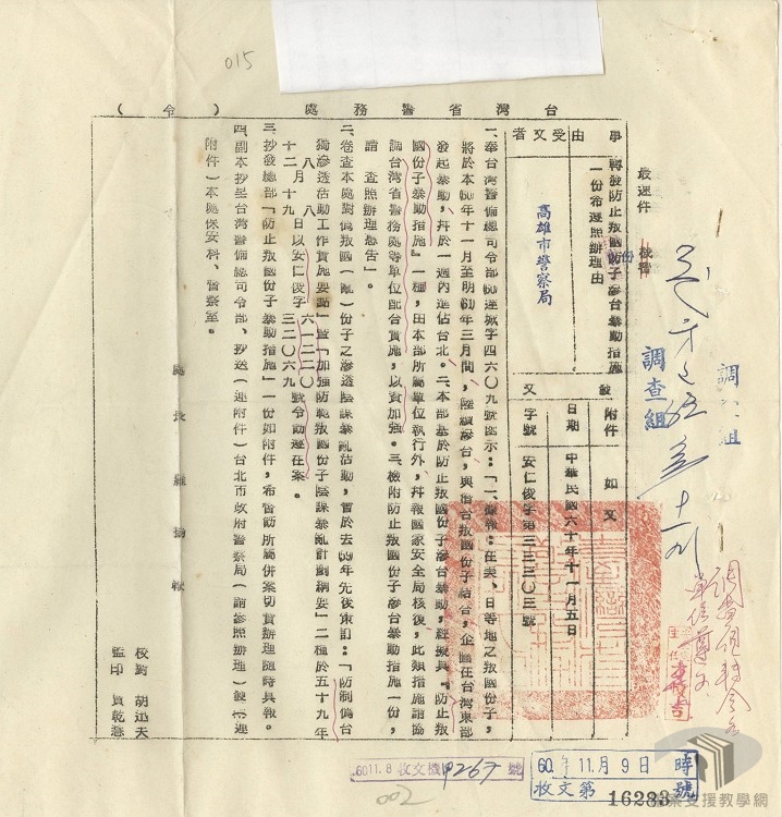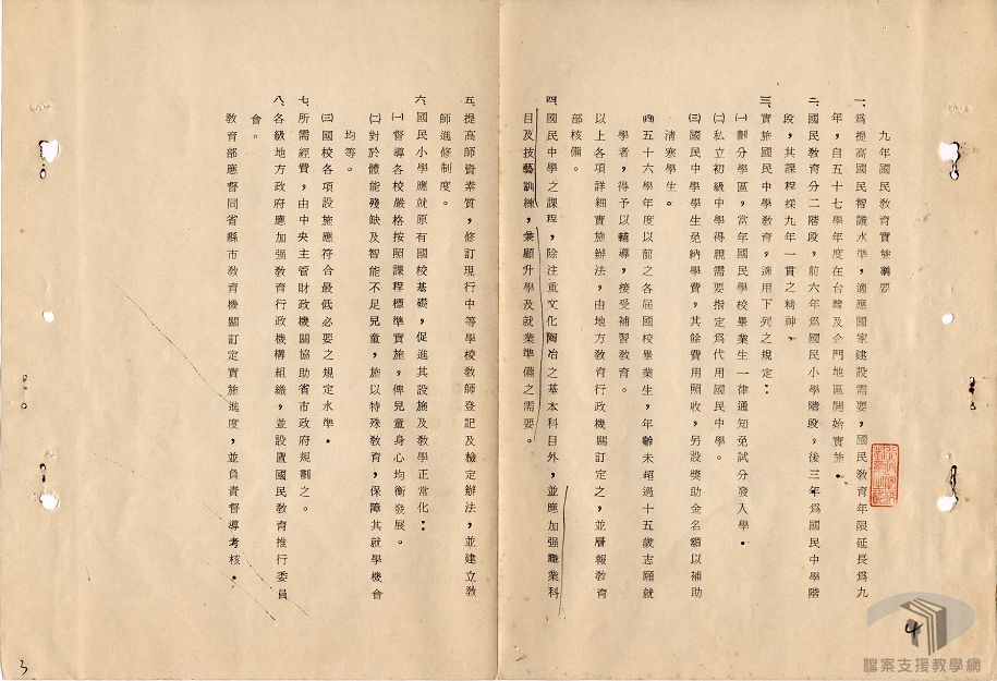 民國38年(1949)5月19日,政府頒布〈戒嚴令〉,臺灣進入戒嚴時期,為有效管理社會,以〈戒嚴令〉為依據,並於5月27日公布〈戒嚴期間防止非法集會結社遊行請願罷課罷工罷市罷業等規定實施辦法〉,翌日公布〈臺灣省戒嚴期間新聞雜誌圖書管理辦法〉,7月28日公布〈台灣省戒嚴時期無線電器材管制辦法〉。41年(1952)6月5日公布〈台灣省戒嚴時期郵電檢查實施辦法〉等各種辦法,並由臺灣省保安司令部(其後併入臺灣警備總司令部)負責取締,限制人身、出版、新聞、通信和言論等各種自由。 民國38年(1949)7月成立「臺灣省政府教育廳國語推行委員會」,41年(1952)4月公布「臺灣省中等以上學校軍訓實施計畫」和「戡亂時期高中以上學校學生軍事、精神體格及技能訓練綱要」,同年5月公布「臺灣省各級學校加強民族精神教育實施綱要」。透過教育,將國語、文武合一和民族精神等概念灌輸於人民,以加強對國家之認同。57年(1968)年,「為提高國民智能,充實戡亂建國力量」,將六年國民義務教育延長為九年。