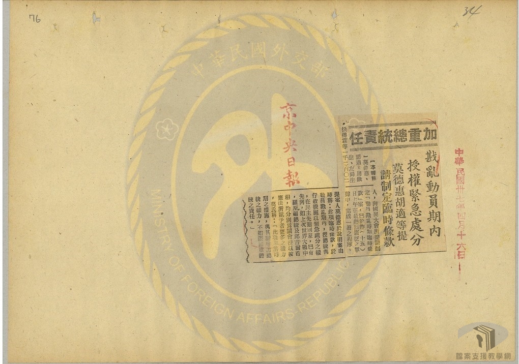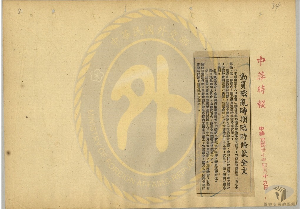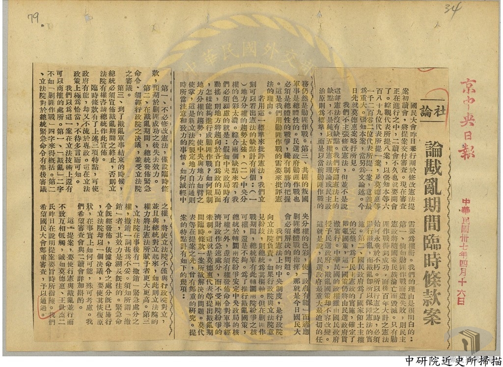 「動員戡亂時期臨時條款」是為因應國共內戰時期所制訂不受憲法本文限制的法律。「臨時條款」授與總統以緊急處分權,並明令於戡亂時期結束後廢止。此條款經國民大會通過於民國37年(1948)5月10日由公布實施,並規定有效期為兩年半。中央政府遷臺後,民國43年(1954)3月國民大會決議繼續生效,之後於民國49年(1960)、民國55年(1966)和民國61年(1972)又進行4次修訂,增加至11項條款。直到民國80年(1991)經國民大會決議後,於5月1日由總統公告廢止。