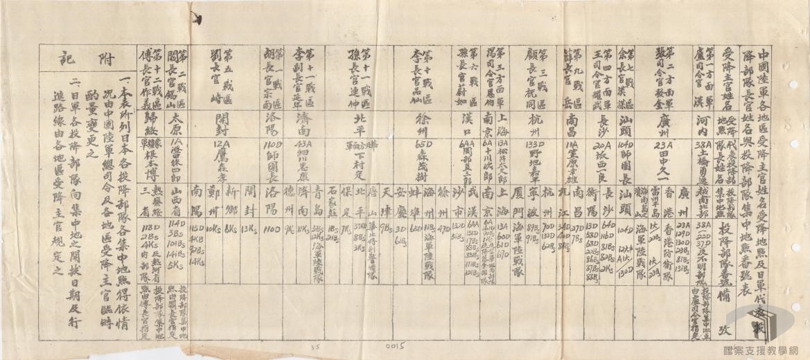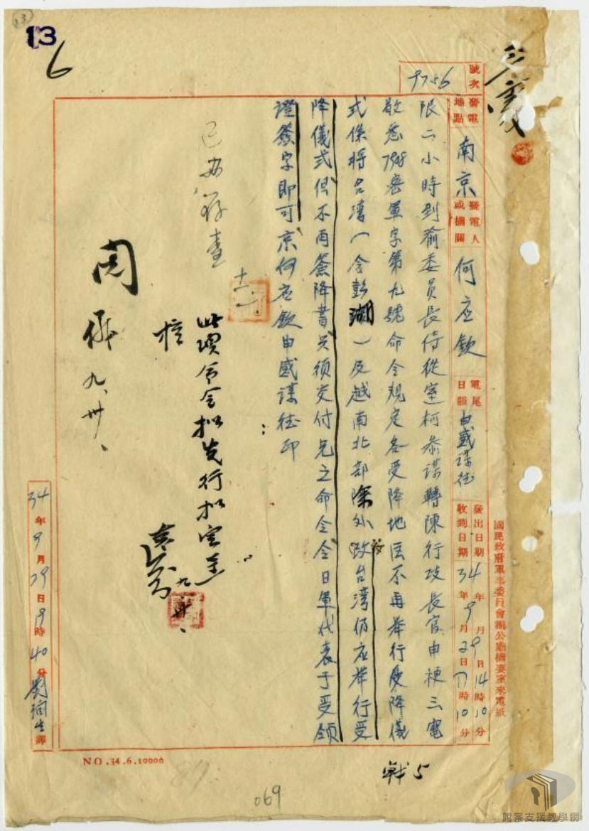 民國34年(1945)8月6日與8月9日,美軍分別在日本廣島和長崎投下原子彈。在此衝擊下,昭和天皇終於民國34年(1945) 8月15日中午12時向全國「玉音放送」《終戰詔書》,日本根據〈波茨坦宣言〉同意無條件投降。 9月2日,盟軍與日本在東京灣的美國軍艦密蘇里號上舉行投降儀式,日本簽訂《降伏文書》。在新的國際關係下,盟軍最高統帥麥克阿瑟第一號命令,規定在中華民國(滿州除外)、臺灣及北緯16度以北法屬越南境內的日本軍隊,應向中國戰區最高統帥蔣中正投降。 9月9日,中國戰區受降典禮在南京舉行,中國戰區代表何應欽與日本代表岡村寧次於是日簽訂降書,同時,蔣中正亦以中國戰區最高統帥身分發布第一號命令,規定受降範圍內的日軍均須受節制,且服從蔣中正及其代表何應欽之指揮。
