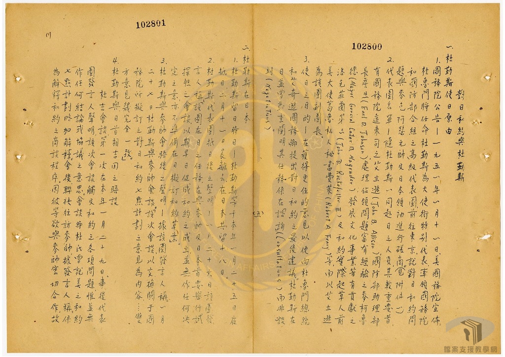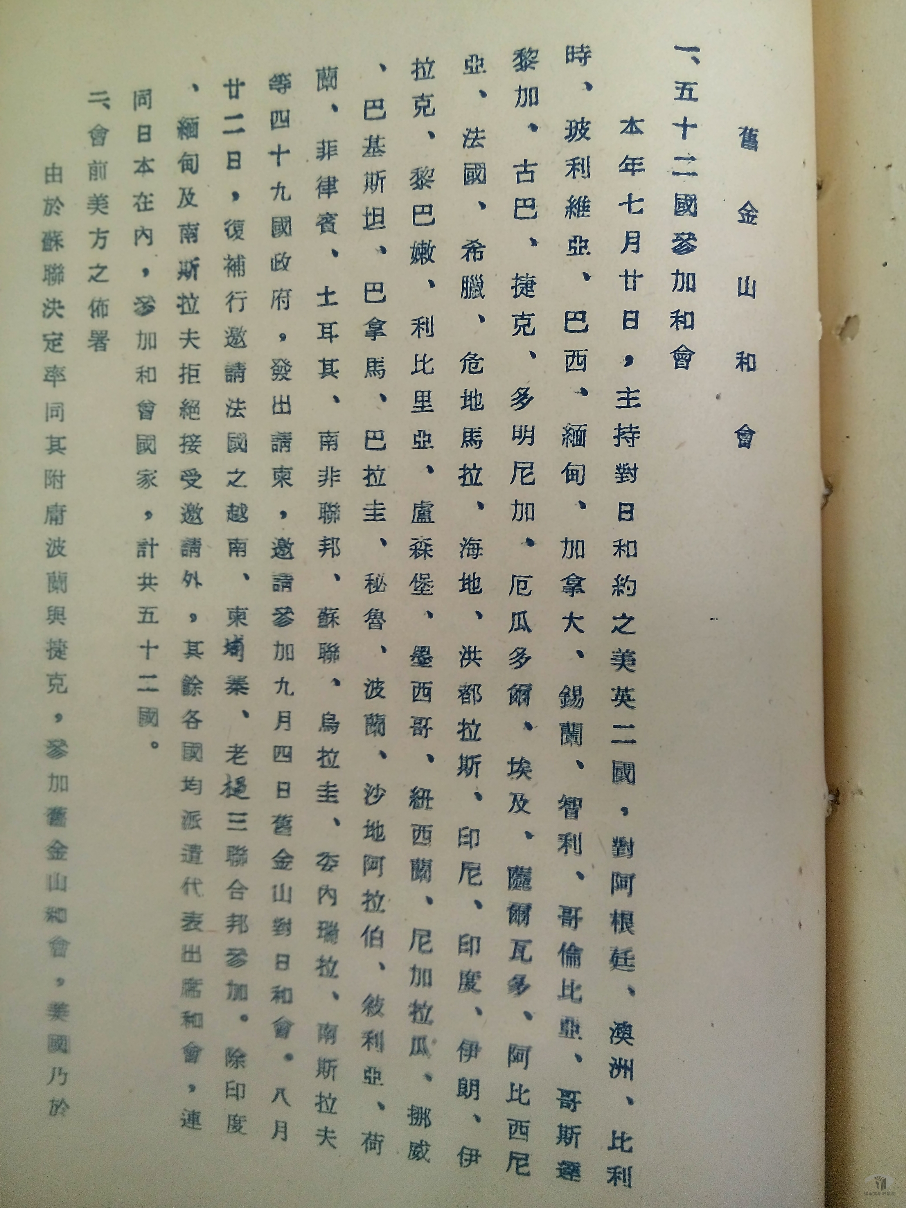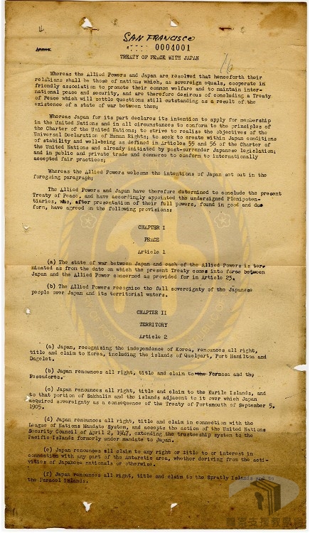民國40年(1951),為解決二次世界大戰後日本的戰爭責任及地位問題,在美國主導下,邀請中華民國、中共除外的54個同盟國及日本至美國舊金山集會,討論對日和平條約問題,其中,印度、緬甸、南斯拉夫缺席,出席舊金山和會的同盟國有51國。9月8日,對日和平條約出爐,通稱為「舊金山和約」,但51國中,蘇聯、捷克、波蘭等3國反對和約內容,拒絕簽字;哥倫比亞、盧森堡、印尼等3個雖簽署和約,但未批准,實際批准和約的國家僅有日本及45個同盟國。民國41年(1952)4月28日,舊金山和約生效,日本結束自民國34年(1945)宣布投降以來被盟軍軍事占領的狀態,邁向新的國際關係。