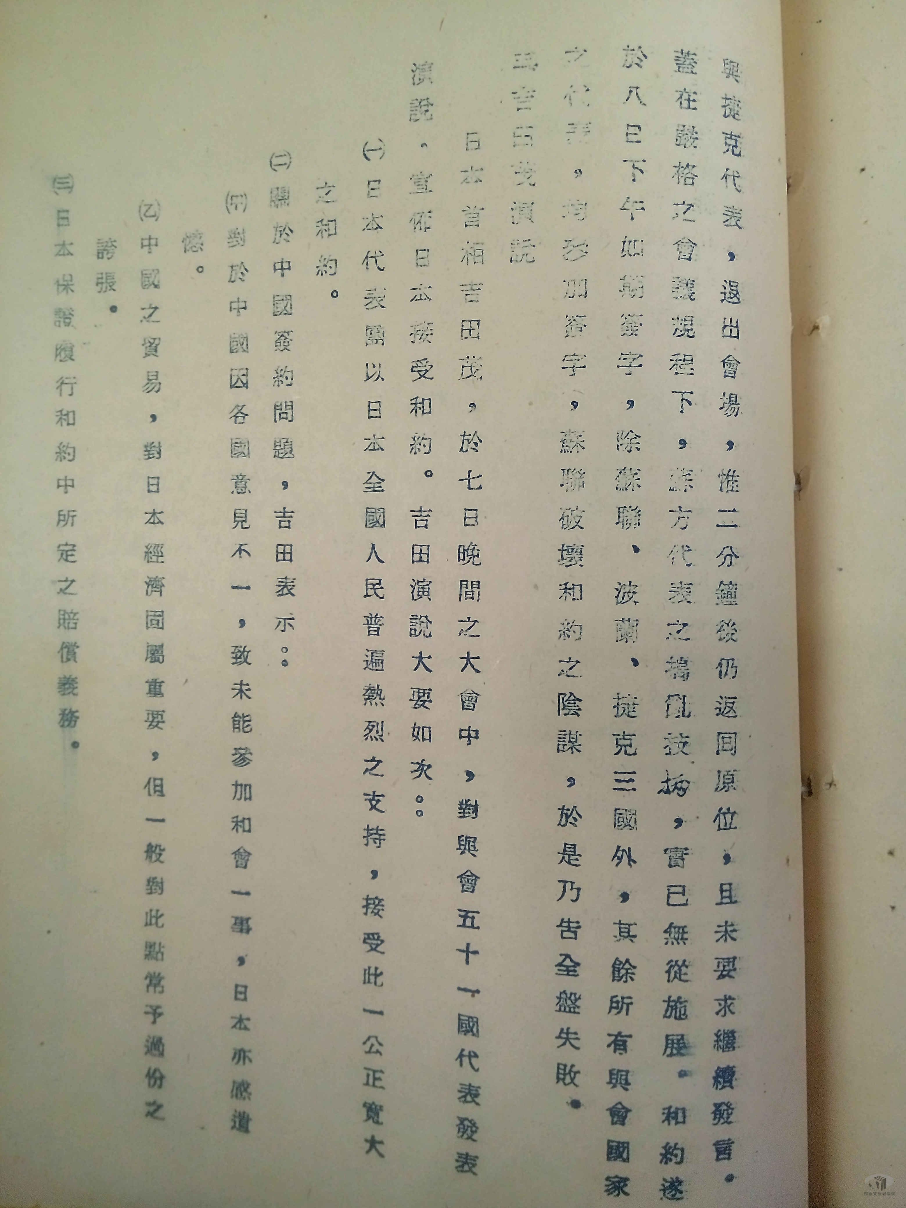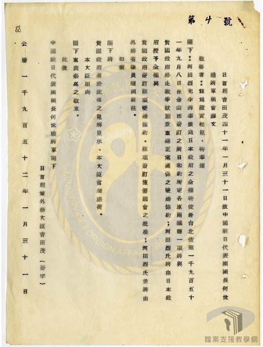 由於兩岸分治,在複雜的國際關係下,美、英、蘇等國對於哪一方政府能代表中國,出席民國40年(1951)召開的舊金山和會產生歧見。最後,國共雙方代表均未出席舊金山會議。美國支持中華民國,並向日本施壓,促成日本在舊金山和約生效前,與中華民國單獨簽訂和平條約。民國41年(1952)2月,中華民國和日本政府分別任命葉公超(時任外交部長)和河田烈為全權代表,在臺北進行2個月的談判。4月28日,雙方代表在臺北賓館簽署「中日和平條約」(日本稱為日華和平條約),日本放棄對於臺灣、澎湖群島以及南沙群島、西沙群島之一切權利、權利名義與要求,兩國正式終止戰爭狀態。