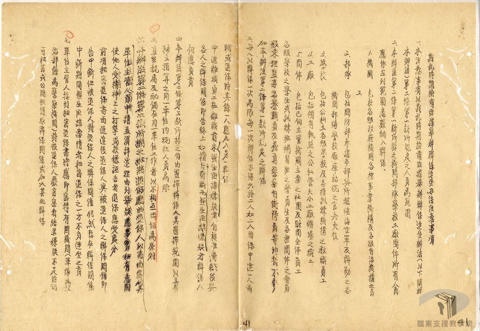 民國39年(1950)年6月13日,政府公布〈戡亂時期檢肅匪諜條例〉。根據本法,只要有匪諜嫌疑者,治安機關除了可以逮捕之外,只要明定匪諜牽連案件,不分犯罪事實輕重,一概由匪諜案件審判機關審理,也使得所謂匪諜嫌疑者或是匪諜案件皆必須受到軍法審判,無法受到普通司法系統之保障,乃戒嚴期間,造成白色恐怖之主要法令之一。民國80年(1991)5月24日,立法院通過廢止該條例。