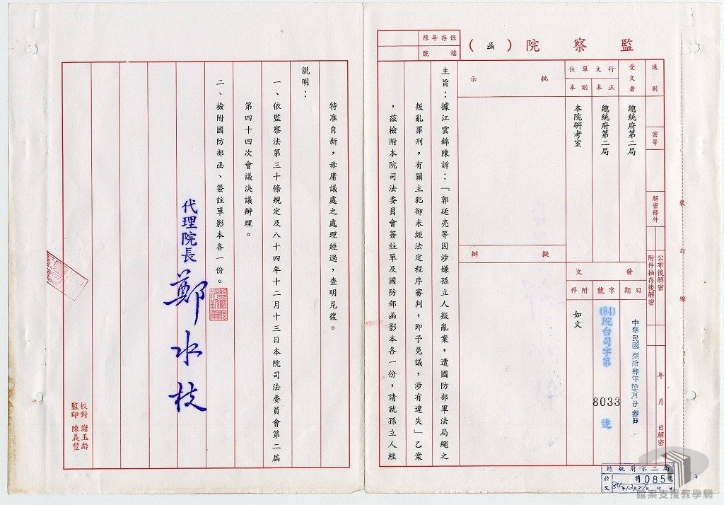 民國44年(1955)郭廷亮以「匪諜」之名被捕後,孫立人辭去總統府參軍長,隨後蔣介石下令拘捕,並命令陳誠、王寵惠、許世英、張群、何應欽、吳忠信、王雲五、黃少谷、俞大維等九人組成委員會調查孫立人,後以其下屬涉嫌軍事政變,孫立人應負責。與孫立人相關人員都受到牽連,其中15人以〈懲治叛亂條例〉被判處唯一死刑,超過一百人被判處徒刑。孫立人自此被軟禁,成為戒嚴期間白色恐怖的受難者,迄至民國77年(1988)才解除。此事件一直到民國90年(2001)公開當時監察院國防委員會之調查報告後,終獲平反。