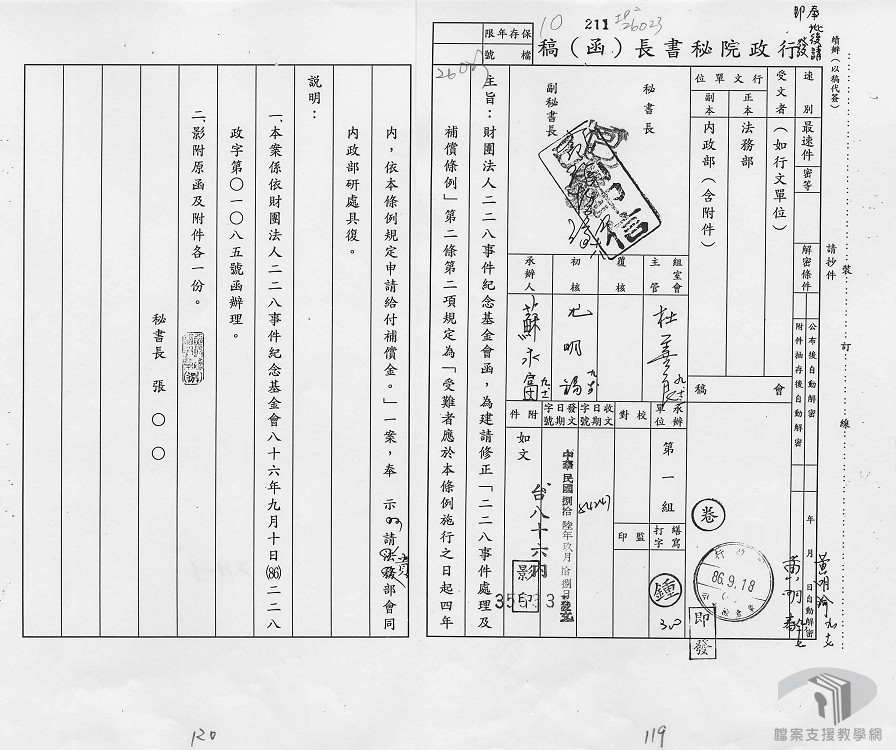民國76年(1987),解嚴後社會各界發起二二八平反運動,為了撫平歷史傷痛,促進族群融和,民國79年(1990)行政院邀請國內學者專家成立「研究二二八事件小組」,於民國81年(1992)出版調查報告。民國84年(1995)2月28日設立「二二八和平紀念碑」,同時於4月7日公布〈二二八事件處理及補償條例〉,規定受難者可依本條例申請補償金,為此於10月設立「財團法人二二八事件紀念基金會」,並將2月28日訂定為「和平紀念日」。