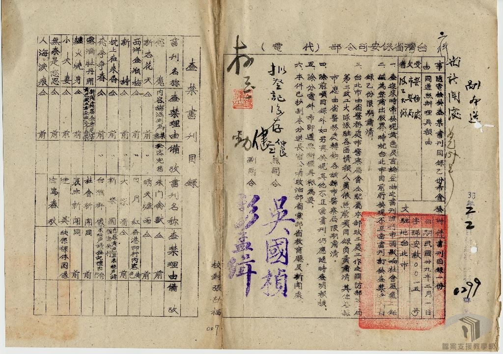 民國38年(1949)5月19日,頒布〈戒嚴令〉,第三條第六項「嚴禁以文字標語,或其他方法散布謠言」據此規定,同年5月28日公布〈臺灣省戒嚴期間新聞雜誌圖書管理辦法〉。民國42年(1953)7月27日公布〈臺灣省戒嚴期間新聞紙雜誌圖書管制辦法〉,臚列七款應管制之文字,同時依據民國42年(1953)保安司令部公布之「報刊圖書審查標準表」所列之「危害主義、危害政府、洩漏軍事機密、危害社會風氣」四大標準查禁書刊,並將被禁之書刊整理成《查禁圖書目錄》出版。
