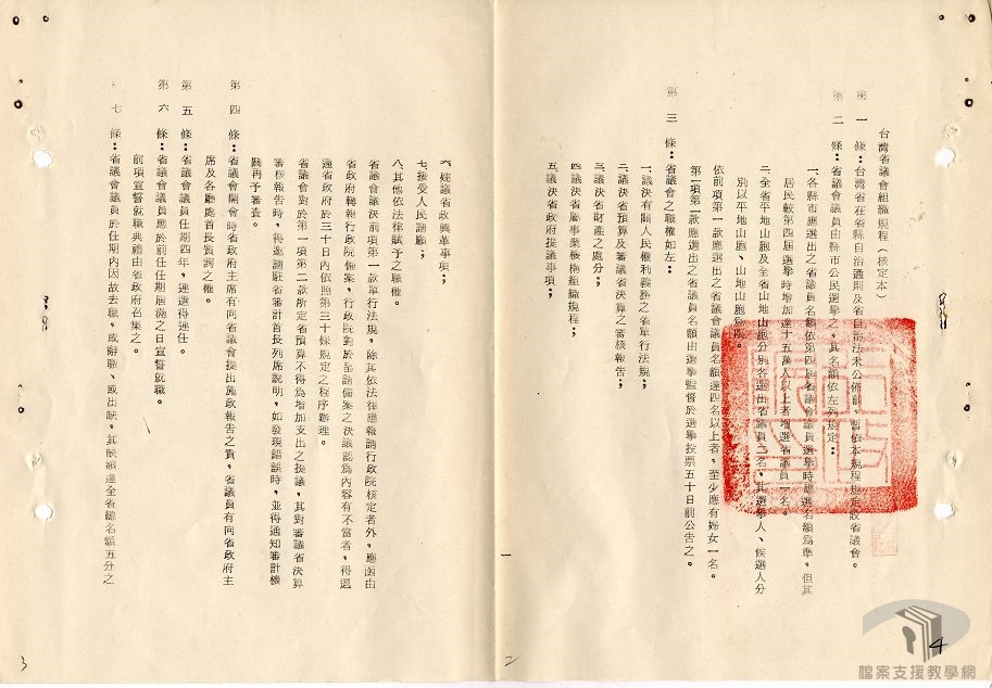 民國35年(1946)5月1日,成立省參議會。在省縣自治通則尚未公布前,40年(1951)12月1日先行成立第1屆臨時省議會,採間接選舉,議員任期為2年;第2屆起改為3年,改直接選舉。由於臨時省議會議員由省民直接選出,同時亦具備議會應有之職權,行政院遂於48年(1959)6月公布「臺灣省議會組織規程」,取消「臨時」二字,將第3屆臨時省議會改為第1屆省議會,其職權照舊。52年(1963)議員任期改為4年,促進民主政治發展。