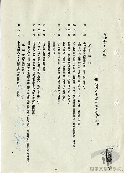臺灣在戒嚴時期,省縣市及直轄市等地區的地方自治並沒有來自立法院的「授權」,而是以「實施地方自治綱要」等行政法令來促進地方政治體制之發展。解嚴以後,地方自治的「法制化」為大勢所趨,民國83年(1994)7月立法院制訂了「省縣自治法」及「直轄市自治法」,自此以後臺灣省及直轄市各級政府的地方自治與選舉有了法源依據,臺灣省及直轄市首長由官派改為公民直選,臺灣的地方自治從此進入了一個「法制」的新階段。此二法於民國88年(1999)廢止。