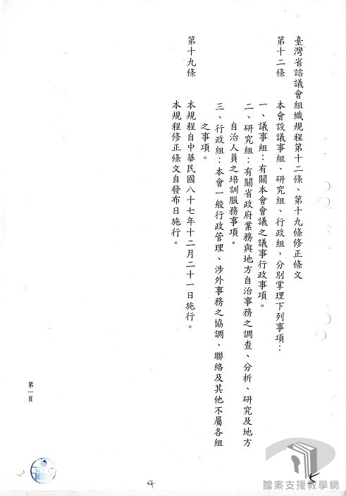 民國87年(1998)12月因精省裁撤了臺灣省議會,據憲法增修條文及精省條例暨行政院頒定「臺灣省諮議會組織章程」,在原址成立臺灣省諮議會並承繼臺灣省議會的所有資產,在地方政治體制上成為了臺灣省政的諮詢機關。諮議員任期為3年,人數至多為29名,並由行政院院長提請總統任命。其主要工作為管理臺灣省參議會、臨時省議會、省議會時期之檔案、公報、議事錄,省議會時期之問政影帶以及地方自治事務之研究發展。