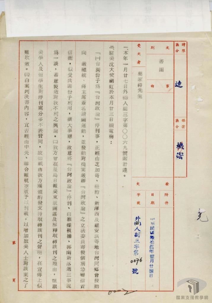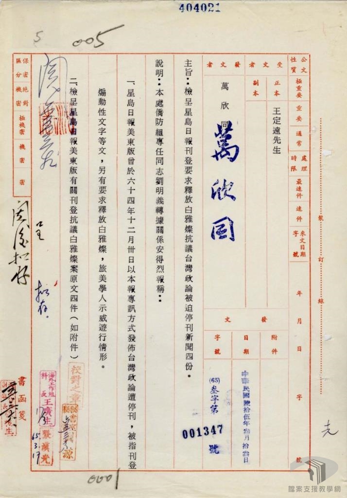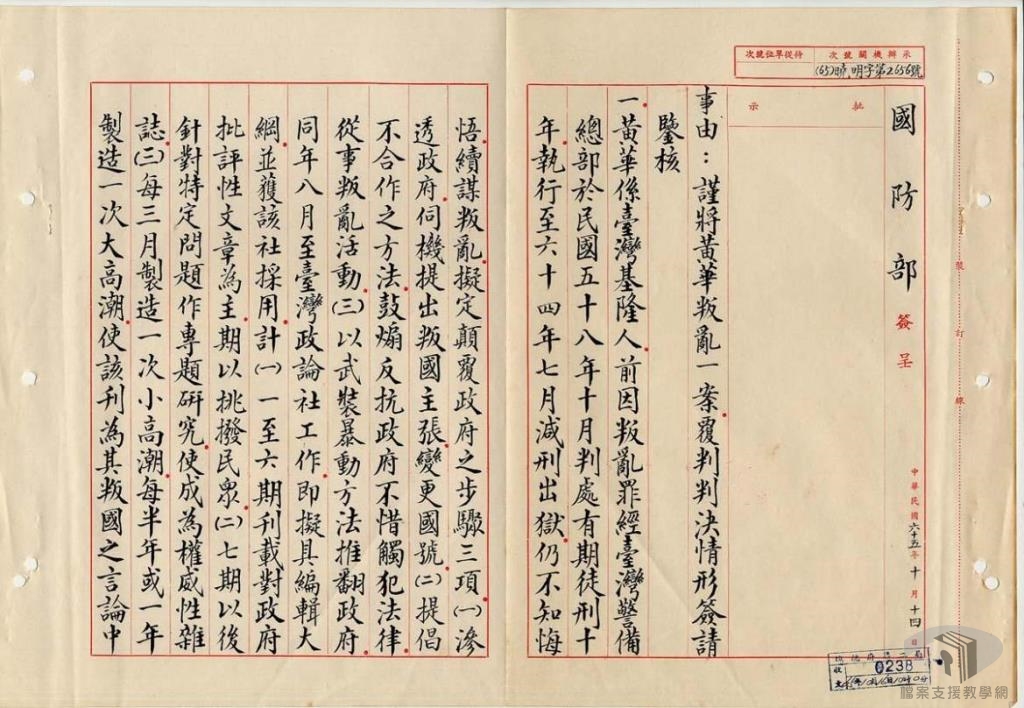 本教案主要利用國家發展委員會檔案管理局成立以來陸續自國防部史政編譯局、國防部軍務局、外交部、臺灣省政府、各縣市政府…等機關所移轉的檔案,配合高中職歷史科、公民與社會之課綱,擬定10個次主題。