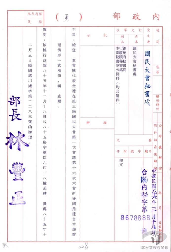 說明 民國85年(1996)4月23日,交通部電信總局函郵政總局,貴局(郵政總局)將於民國85年(1996)5月20日發行第九次總統副總統直選就職紀念郵票乙套四枚,徵請同意移用貴局票圖案供製印公用電話通話卡事。