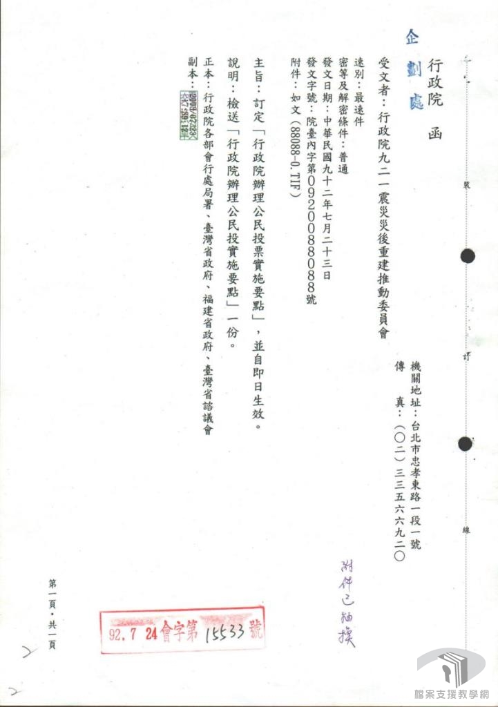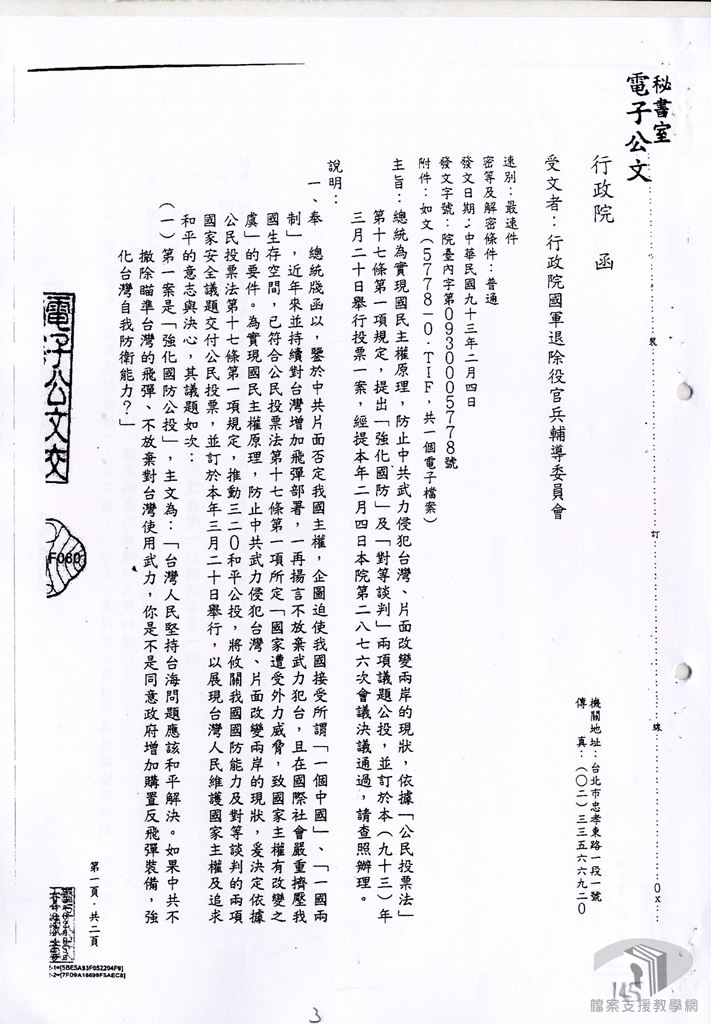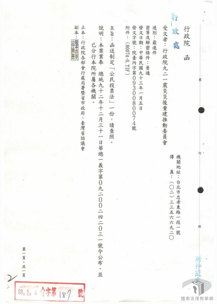 「公民投票法」的基本精神,在於透過直接民權的形式,以實現憲法保障人民所具有創制及複決權,國大代表即有制定「公投法」的建言。民國92年(2003),朝野雙方因核四問題於立法院展開「公民投票法」的攻防戰,11月通過「公投法」,於93年(2004)1月2日生效。至此公民投票取得法源依據,1月20日由行政院公告「公民投票法施行細則」。92年7月公告的「行政院辦理公民投票實施要點」,則於93年2月停止適用。