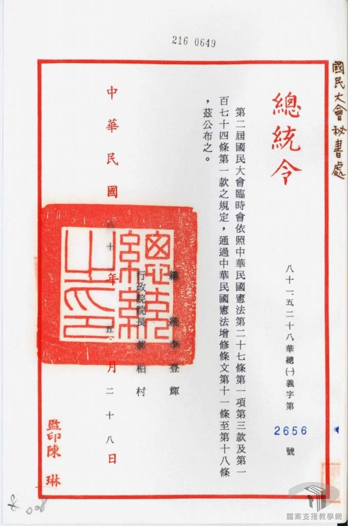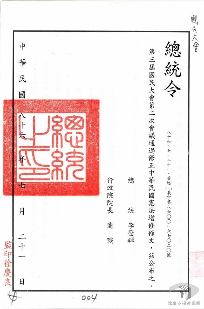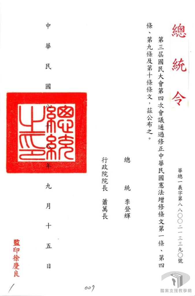「動員戡亂時期臨時條款」廢除後,政府為因應國家統一之需要,在不影響憲法本文的原則下,制定了「中華民國憲法增修條文」。自民國80年(1991)5月始,至94年(2005)6月止共公布7次,現今條文共有十二條:第一次制定十條;第二次增訂十一至十八條;第三修訂為十條;第四次修訂為十一條;第五次修正條文公布後,因違背修憲程序經大法官宣告無效;第六次修正部分條文;第七次修正部分條文並增訂第十二條。