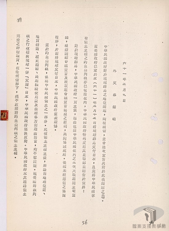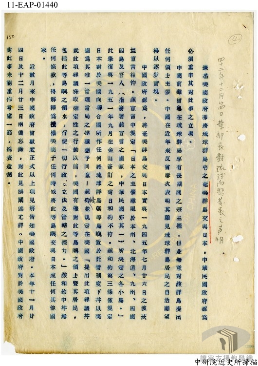 民國42年(1953),美國決定將琉球群島北部的奄美島歸還日本,我國雖表達反對立場,但無效果。59年(1970),美、日兩國達成協議,美國準備在2年後將琉球歸還日本,此舉再度引發我國政府強烈反對,且引發釣魚臺主權爭議,但琉球仍如期在61年(1972)回歸日本統治。