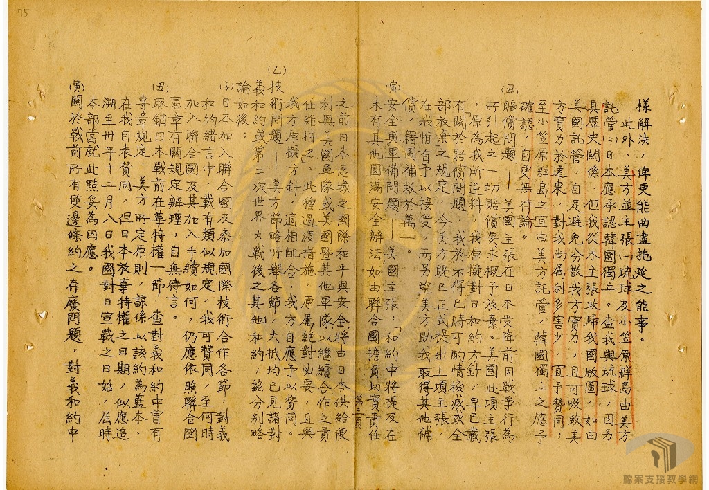 戰爭結束後,隨著對日和平條約的討論,琉球歸屬問題再度浮上檯面,美國部分人士主張將琉球群島依風土民情分為南、北兩部,南部劃歸臺灣,由中華民國統治,北部歸還日本;亦有主張由聯合國託管。我國反對琉球歸還日本或交由聯合國託管,主張遵照開羅會議決議由中、美共同託管,其次可接受由美國單獨託管。最終,琉球確定由美國託管。