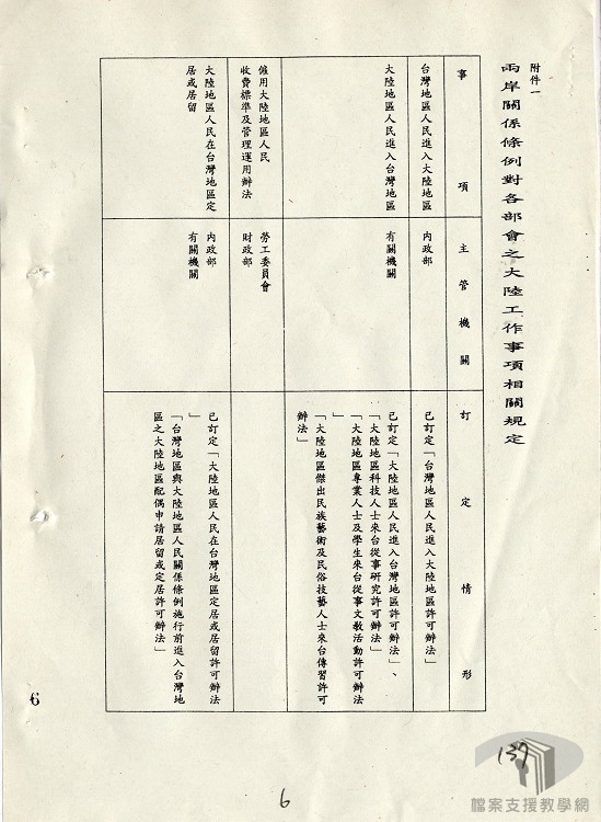 兩岸開放接觸初期,臺灣與大陸地區的相關事務只能依據實際需要制定行政法令管理。民國80年(1991),政府廢除動員戡亂時期臨時條款,臺灣對大陸終止敵對關係,也移除制定大陸事務相關法令之阻礙。81年(1992)7月31日,總統府公布「臺灣地區與大陸地區人民關係條例」(簡稱兩岸人民關係條例),做為規範兩岸人民交流的基本準則,兩岸人民關係條例成為眾多相關兩岸關係法令的母法。各行政主管機關可依條例授權與規定,訂頒相關許可辦法,使兩岸交流具有法制基礎。