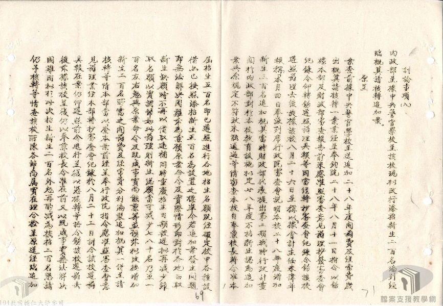 民國25年(1936)國民政府為統一全國警官教育,合併內政部警官高等學校及浙江省警官學校,並於同年9月1日成立中央警官學校。校址設於南京馬群鎮,辦理二年制及三年制正科教育。