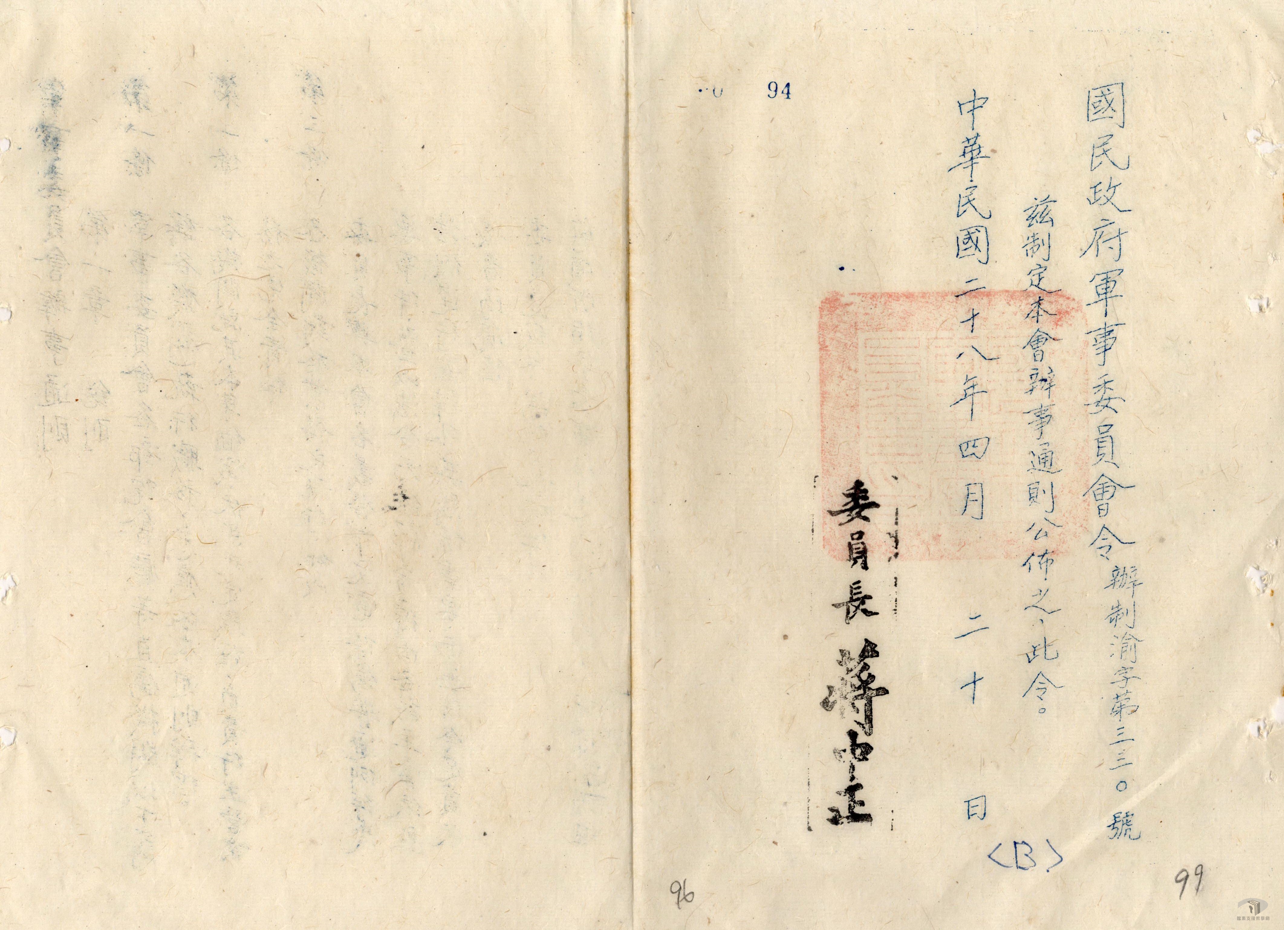 國民政府軍事委員會於民國14年(1925)7月1日成立於廣州,統轄國民政府內所有陸海空軍隊及相關的軍事單位。國民革命軍北伐成功後,於民國17年(1928)11月將其所有職權轉移至國民政府軍政部、參謀本部以及軍事參議院,隨即結束階段性任務。民國21年(1932)上海一二八事變爆發後,為因應日本的侵略,國民政府再度恢復軍事委員會,由蔣中正擔任委員長。