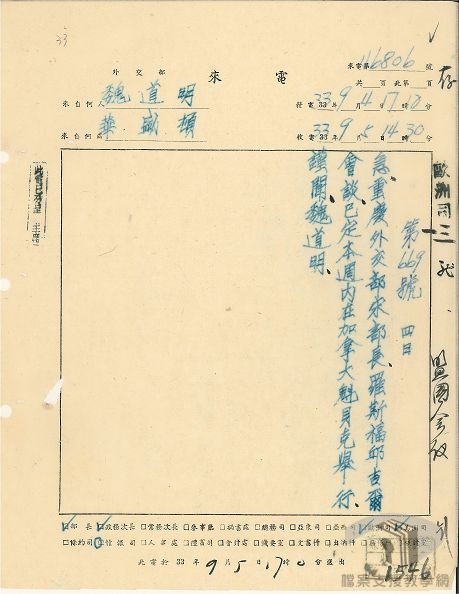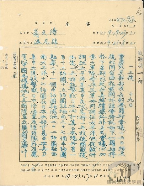 二戰期間,盟國先後進行多次重要會議,除了要解決戰時盟友間協同戰爭策略,也為戰後的新世界做出擘劃,對中國與世界皆有重要影響。民國32年(1943)8月與民國33年(1944)9月,美國總統羅斯福與英國首相邱吉爾先後在加拿大魁北克召開過兩次高層軍事會議。會議主軸雖著重歐洲戰場,但也討論對日作戰構想。參與會議者除美、英、加高階官員外,中國代表宋子文參加了第一次魁北克會議。會前,中國原希望能平等的加入盟國各合作機構的運作,特別是能參與盟國軍火分配,但並未達成目的。