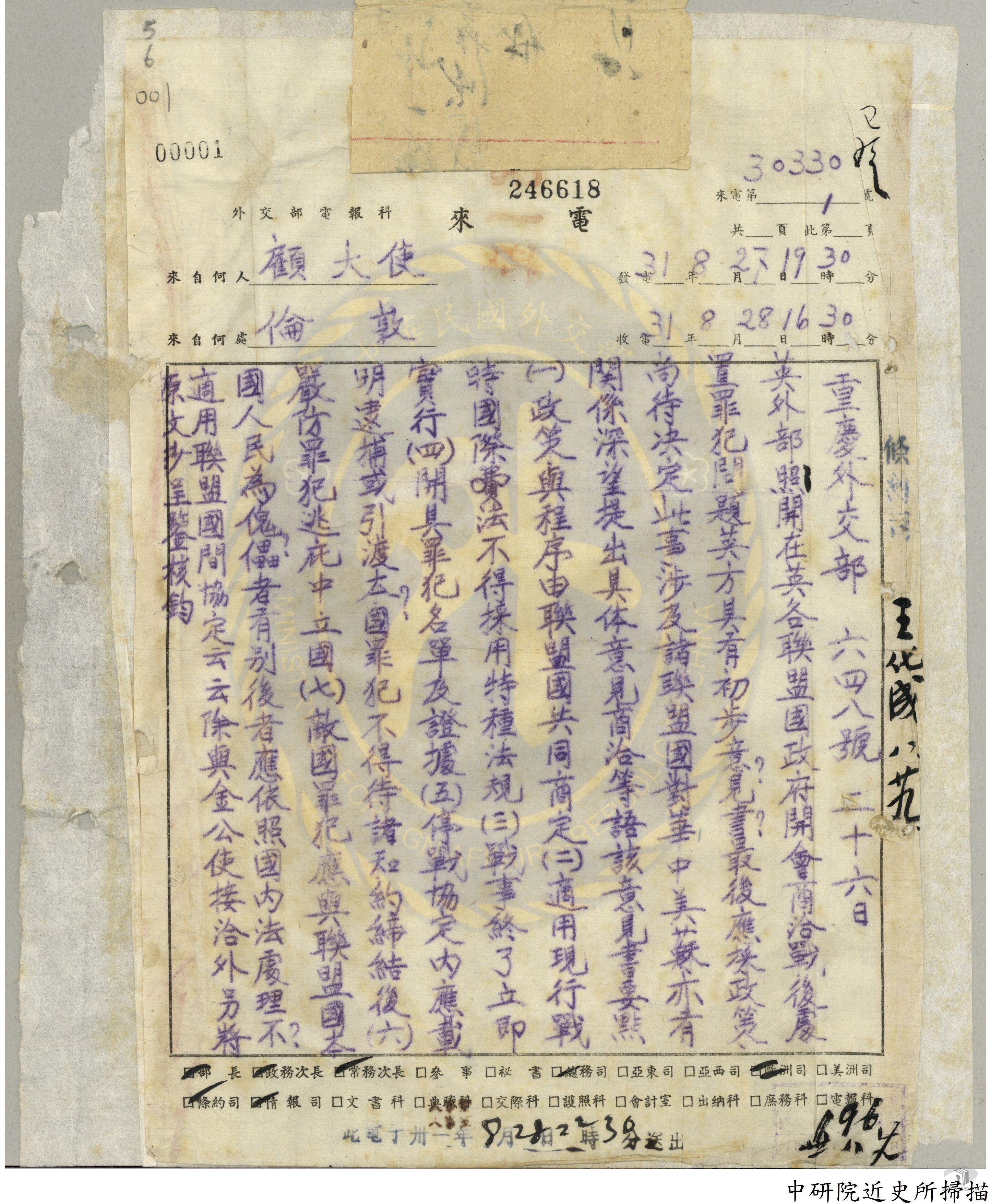 民國33年(1944),聯合國戰罪會遠東及太平洋分會(The Far Eastern and Pacific Sub-Commission)在重慶設立,是第一個以聯合國為名在中國成立的機構。
