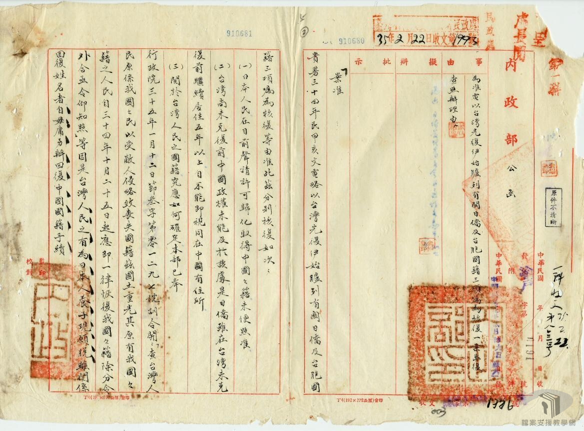 原為日本籍的臺人,自民國34年(1945)10月25日臺灣光復之日起,自動恢復中華民國國籍,成為中華民國國民。而旅居國外臺僑願意恢復國籍,逕向當地大使館或領事館申請登記即可。不過這些旅居海外臺民,處境更為困苦,幾乎被當作是戰俘而被管收的臺籍日本兵,紛紛被遣返回臺。民國35年(1946)3月7日,臺灣省行政長官公署為便利各省歸臺僑胞起見,訂定「臺灣省旅外軍民回籍安置辦法」,由其登岸當地縣市政府辦理接待安置事宜,儘速將其送回原籍,完成回鄉心願。