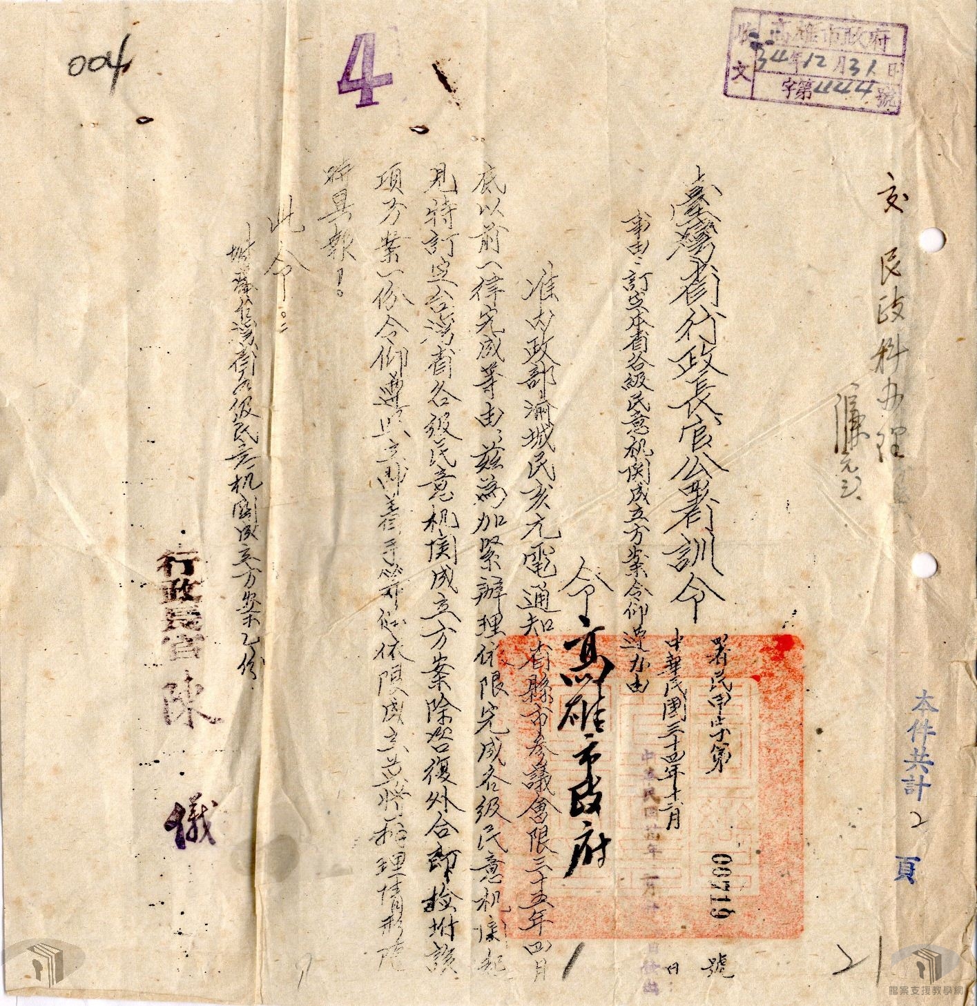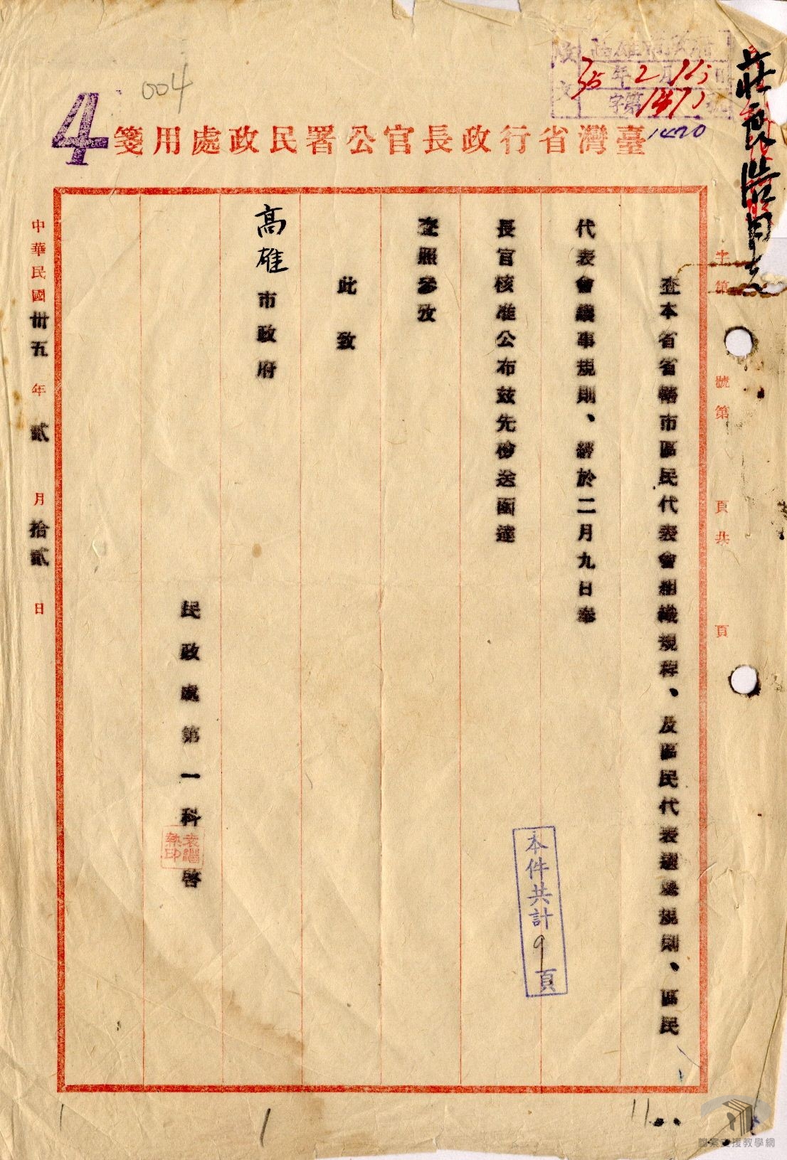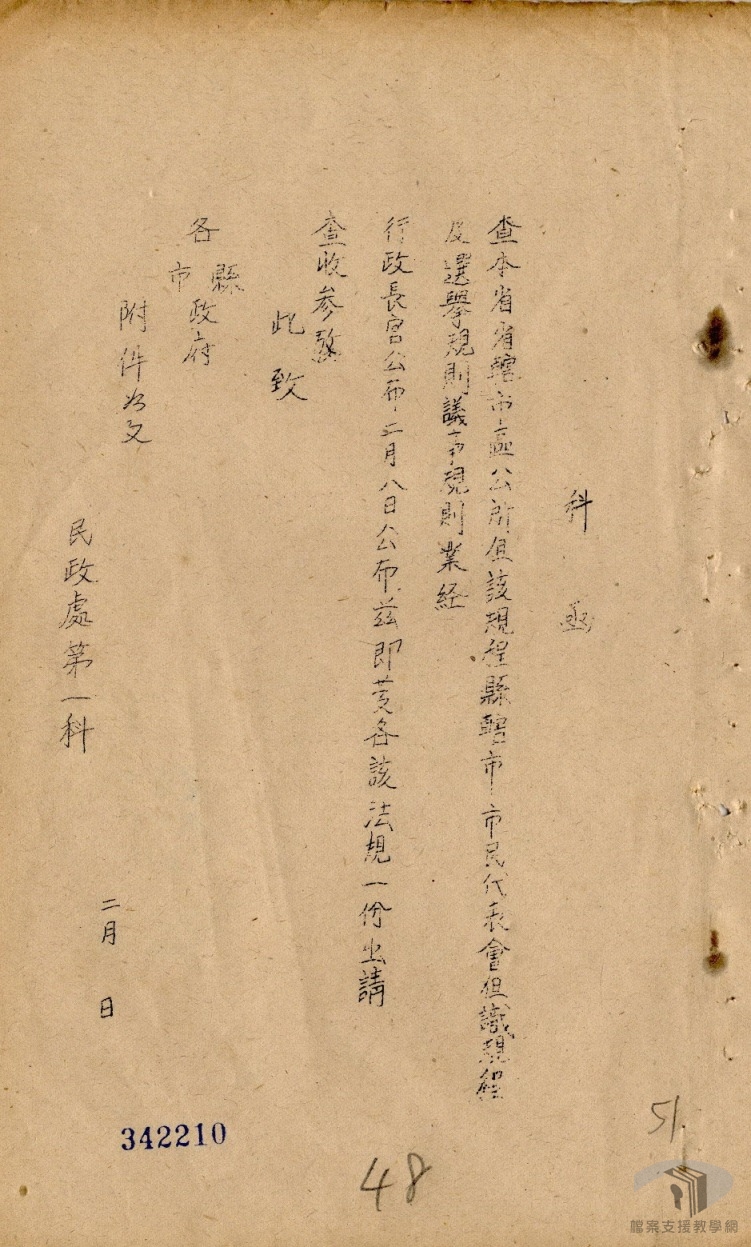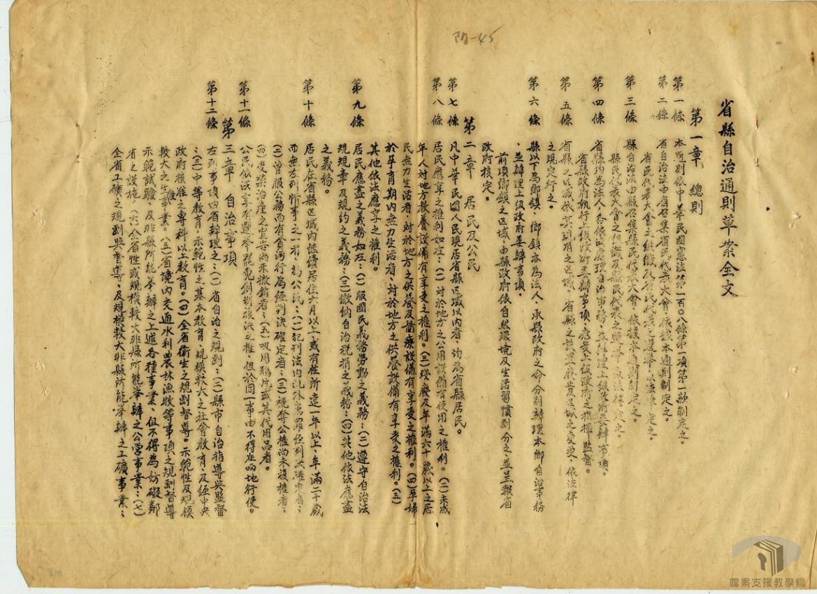 地方自治是民主政體基本要求,光復後,地方自治雖以行政命令行之,但各層級地方政府與議事機關相繼成立,開啟了臺灣地方自治發展的序幕。其實早在民國34年(1945)3月國民政府曾頒布「臺灣接管計畫綱要」,其中「內政」第四項即強調「接管後應積極推行地方自治」。光復後,臺灣省行政長官公署在推動接收工作的同時,即將地方自治列為民國35年(1946)的施政重點,並先於34年12月24日公布「臺灣省各級民意機關成立方案」,做為全省各級民意機關設置的依據。