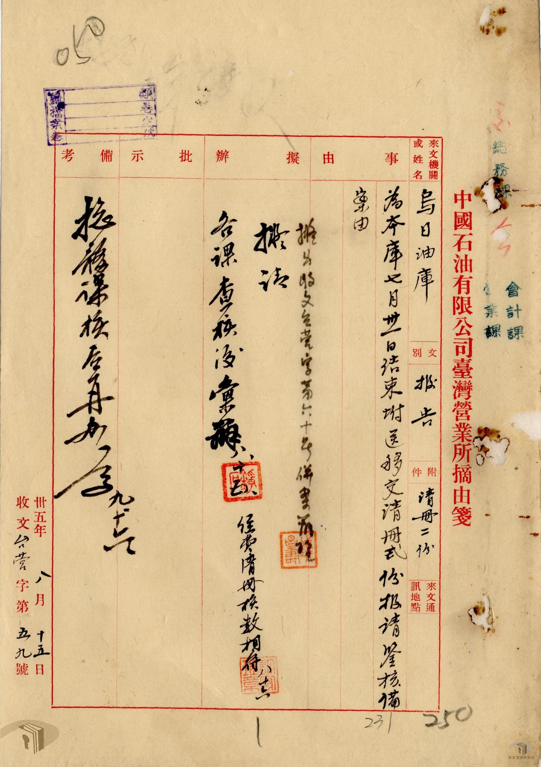 日據時期,臺灣的石油產業相當發達。光復之初,石油事業接管委員會負責接收日產石油事業。民國35年(1946)6月1日,中國石油有限公司於上海成立,為國營事業,隸屬資源委員會(按:民國38年(1949)隨政府播遷來臺後,改隸經濟部)。中國石油有限公司成立之後,隨即在臺灣設立臺灣營業所,除了持續接收日產外,也從事油氣之進口、開發、煉製、輸儲與銷售,以及石油化學原料之生產供應。