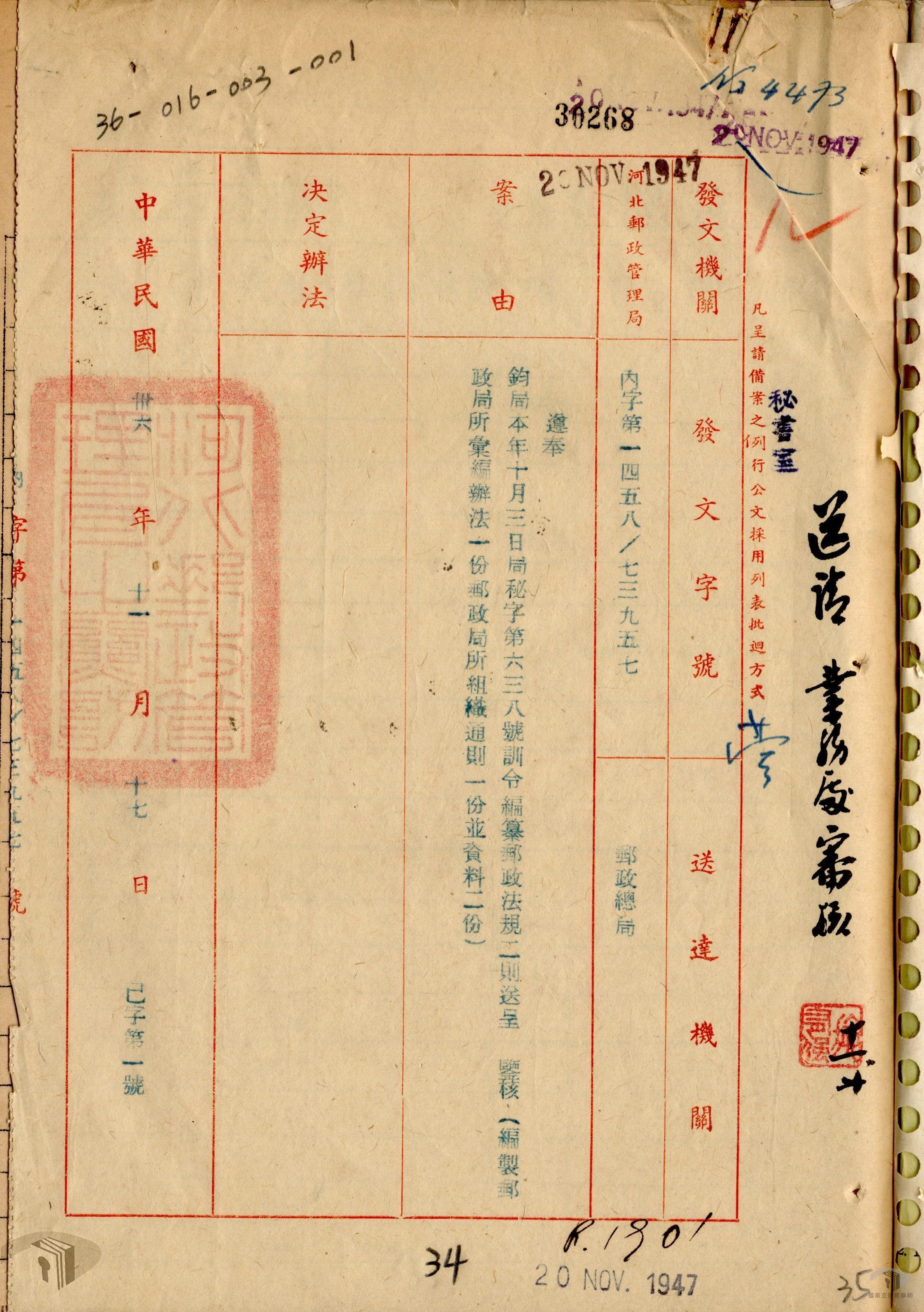 民國34年(1945)11月1日,臺灣省行政長官公署交通處設立「郵電管理委員會」,接管全臺郵電業務。民國35(1946)年1月,交通部統一全國電信機構組織,臺灣郵電業務劃歸交通部接辦,並於同年5月5日成立「臺灣郵電管理局」,試行在中國本就已有的郵電合辦,惟結果未如理想,交通部乃於民國38年(1949)4月1日核准臺灣郵電管理局改組,分別成立臺灣郵政管理局及臺灣電信管理局,臺灣郵政管理局隸屬交通部郵政總局。