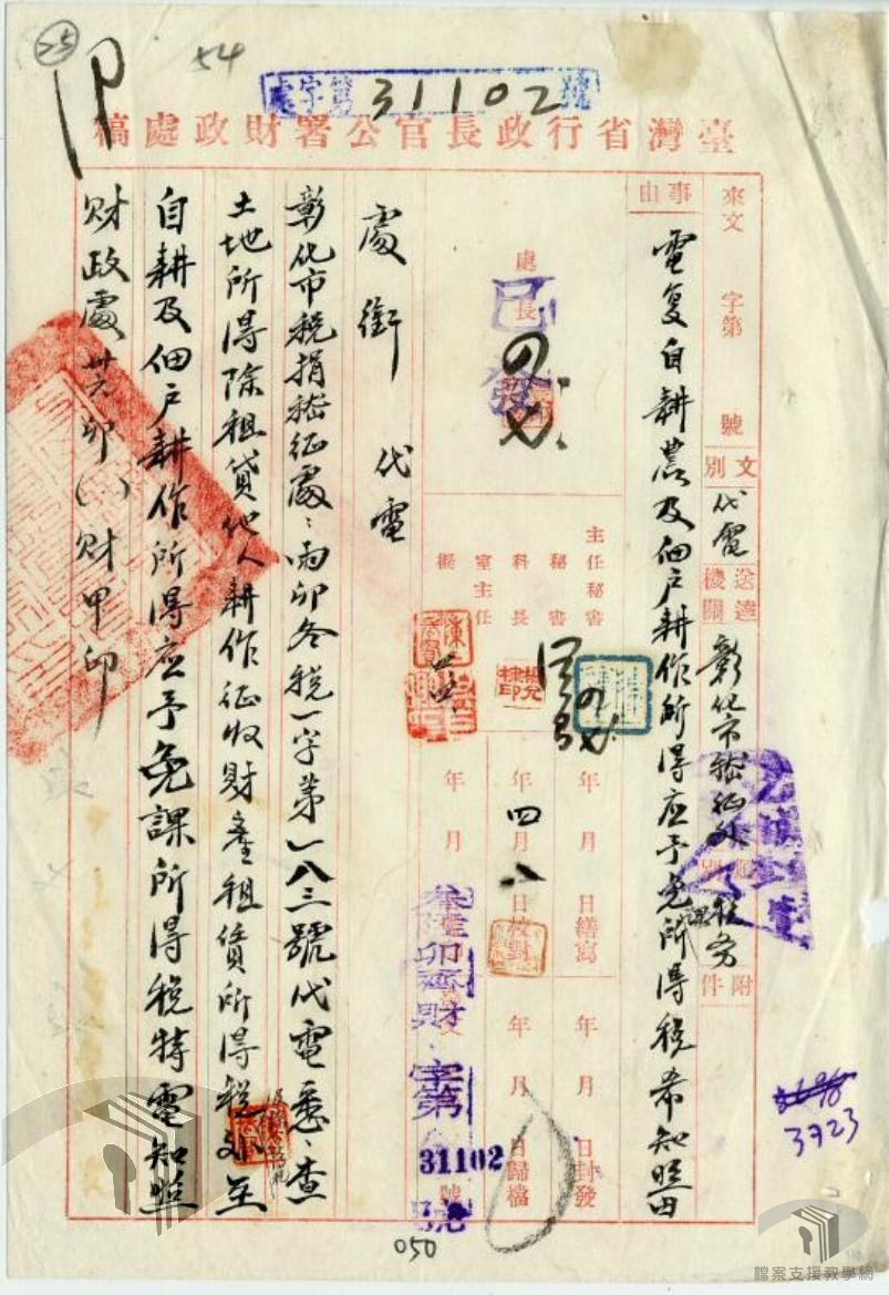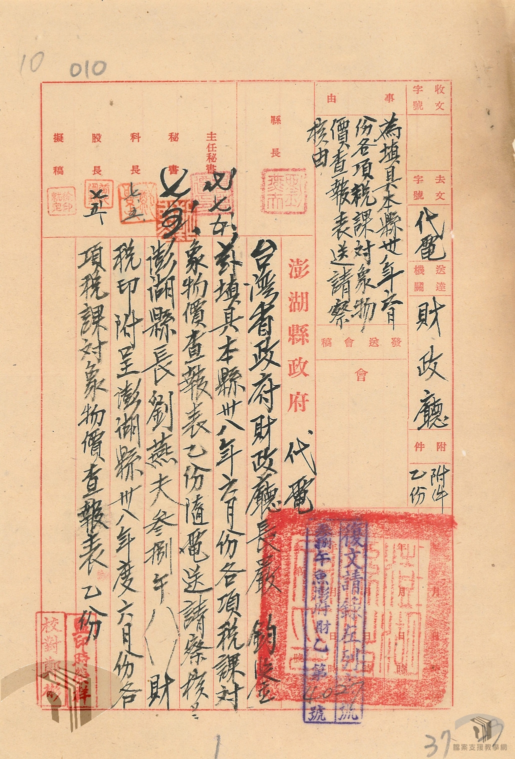 光復後,臺灣各縣市成立稅務稽徵處(所),民國36(1947)年擴大編制為稅捐稽徵處(所),受臺灣省政府財政處監督,負責轄區國、省及地方各種稅捐稽徵事宜。此外,由於各縣市稅捐稽徵處業務與各縣市政府財政科(局)關係密切,為使各該主管人員易於分工合作,俾增進工作效率起見,36年2月13日臺灣省行政長官公署通知各縣市政府,依照「各縣市稅捐稽徵處與各縣市政府財政科(局)之職掌劃分及其聯繫辦法」規定辦理。