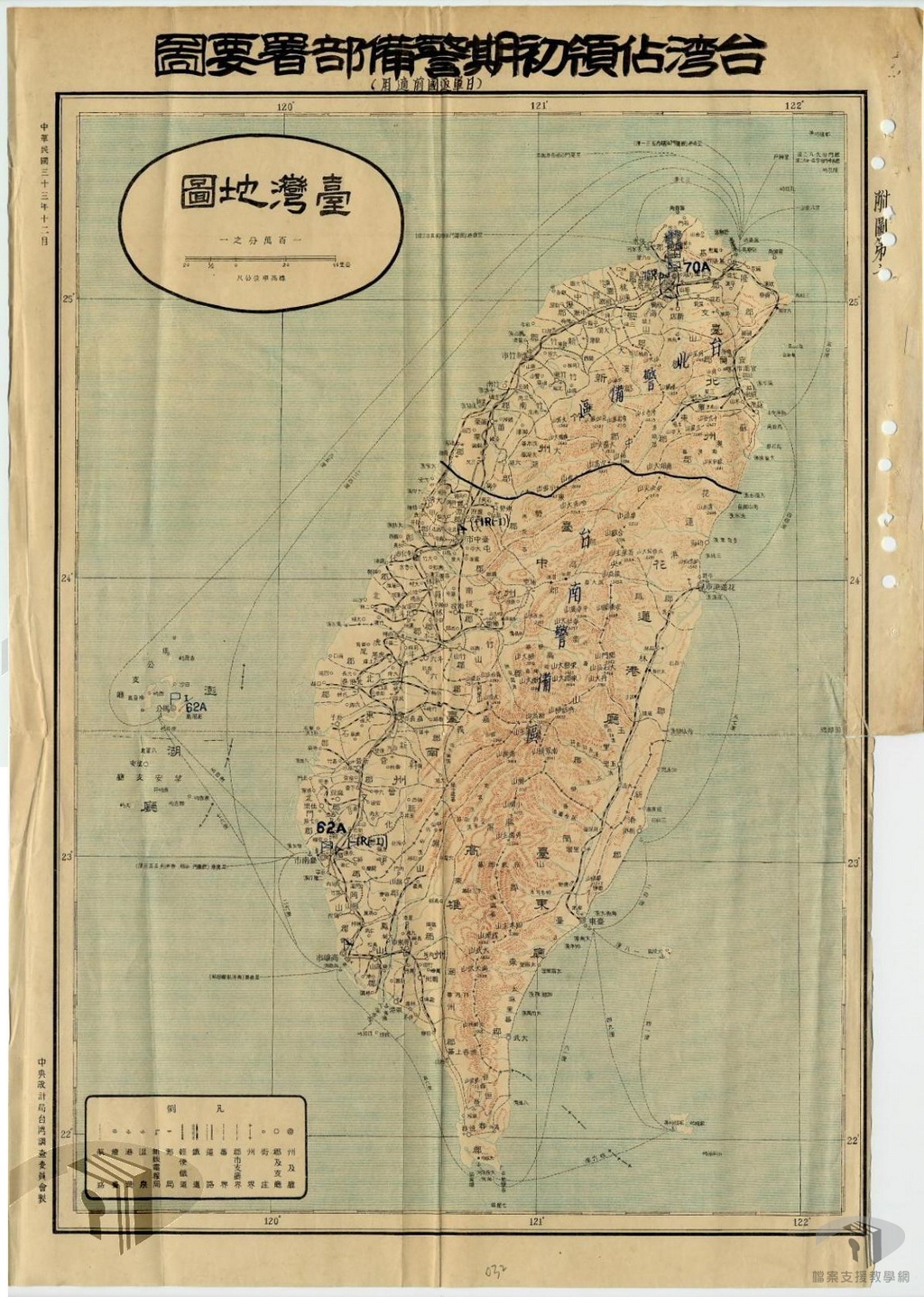 民國34年(1945)9月1日,臺灣省警備總司令部於重慶正式成立,國民政府將軍事接管臺灣任務劃歸警備總部負責,警備總部依據「臺灣省收復計畫大綱」,與美方連絡組共同研討,以軍事占領原則制訂「臺灣省占領計畫」。10月7日,報請給軍事委員會委員長蔣中正與陸軍總司令何應欽鑒核備案,並轉知第六十二軍長黃濤與第七十軍長陳孔達遵照辦理。