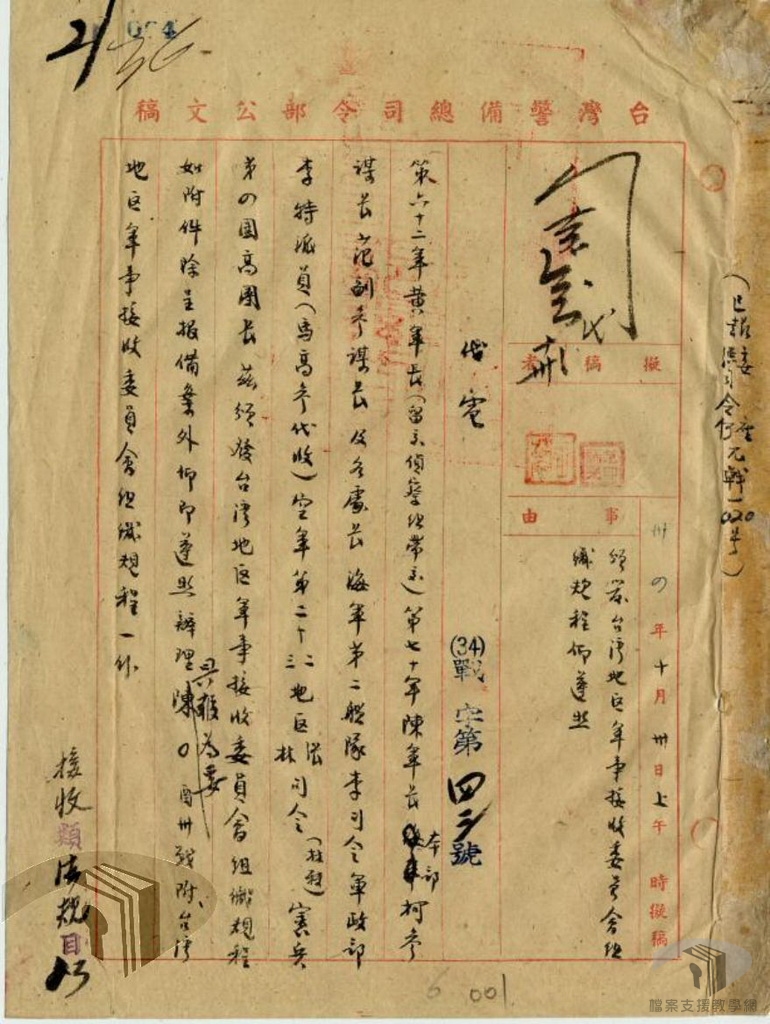 臺灣省警備總司令部為統一臺灣地區軍事接收之步驟及因應臺灣複雜之軍事環境,並為加強臺日雙方軍事交接工作效率,特於民國34年(1945)11月1日下設臺灣地區軍事接收委員會,由警備總部柯遠芬參謀長、范誦堯副參謀長負責主持,臺灣地區日本官兵善後連絡部涉外委員會諫山春樹委員長率所屬必要人員歸柯遠芬指揮,配合軍事接收事宜。軍事接收委員會依業務區分,下設陸軍第一組、陸軍第二組、陸軍第三組、軍政組、海軍組、空軍第一組、空軍第二組、以及憲兵組等8個接收組,承警備總司令之命令,分擔在臺軍事接收業務。