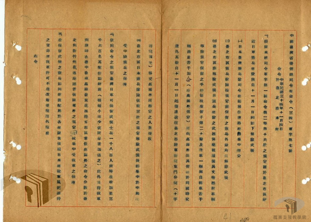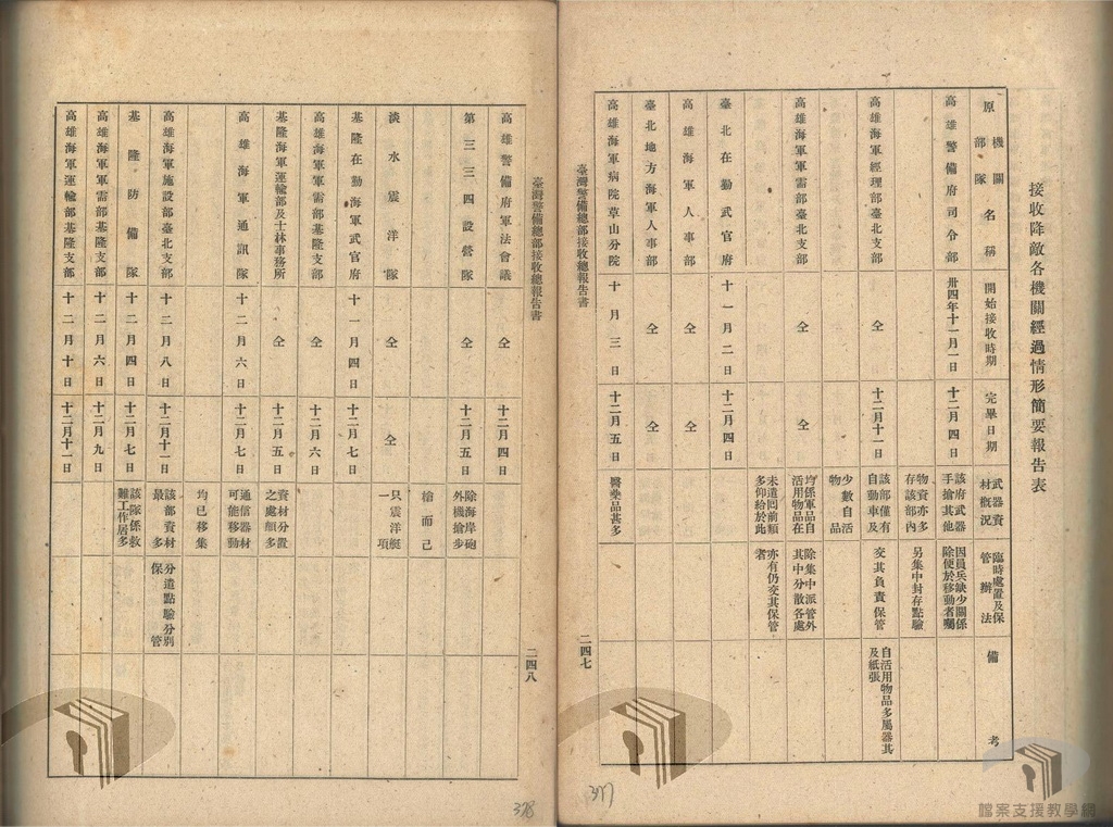 民國34年(1945)11月1日起,臺灣地區軍事接收委員會開始接收在臺日本軍事機關、部隊、要塞,包括其武器、裝備、車輛、馬匹、器材、營建、設備、文卷、圖書、以及全軍之通信犬鴿等,採列冊移交。在軍事機關方面,例如臺灣省警備總司部接收臺灣第十方面軍及軍管區司令部,海軍接收高雄警備府司令部、高雄海軍經理部、軍需部與運輸部等18個單位,空軍則接收日本陸軍第五野戰航空修理總廠等13個單位。